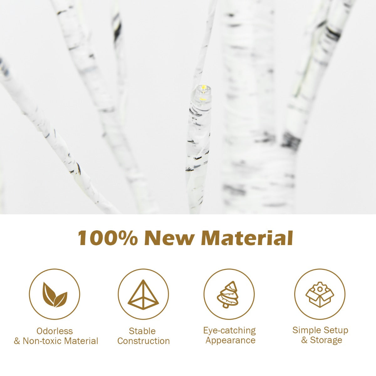 This is our elegant holiday white birch tree. The tree is equipped with 72 LED lights, providing warm white lights for your room during the night. A room with decoration trees can always bring a festive atmosphere to your home. The branches of the tree are flexible enough to be bent into any shape as you wish. We adopt 100% new material to build this tree. This recyclable material is odorless, non-toxic, durable, as well as lightweight to move around easily. The plug is certified by UL with low output voltage to ensure safe use. Don't miss our elegant twig birch tree and take it home to decorate your home!