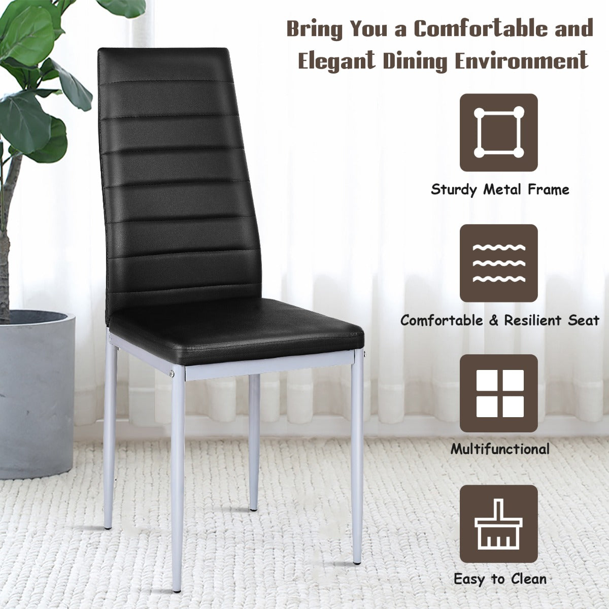 This is our brand new dining chairs set which will offer you a comfortable seating experience. It's simple but elegant design makes it perfect for home, restaurant, company use etc. It is in high quality and comes at a very good price. Waterproof and anti-aging pvc leather combining with heavy duty metal frame provides you years of durable use. plus, ergonomic high curved back offers support for your spine. Add a touch of fashion to your dining room or restaurant with those elegant chairs. Bring them home and let them make you dining room a cozy place now.
