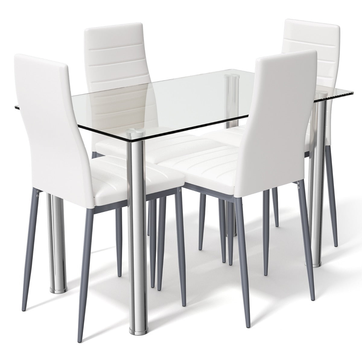 5 Piece Dining Set: This 5 piece dining table set includes 4 chairs and one dining table with temper glass tabletop. With elegant streamlined appearance, this modern table chair set can match plenty of room decorations and make your room look more stylish. You can enjoy warm dining time with your family on the spacious desk.