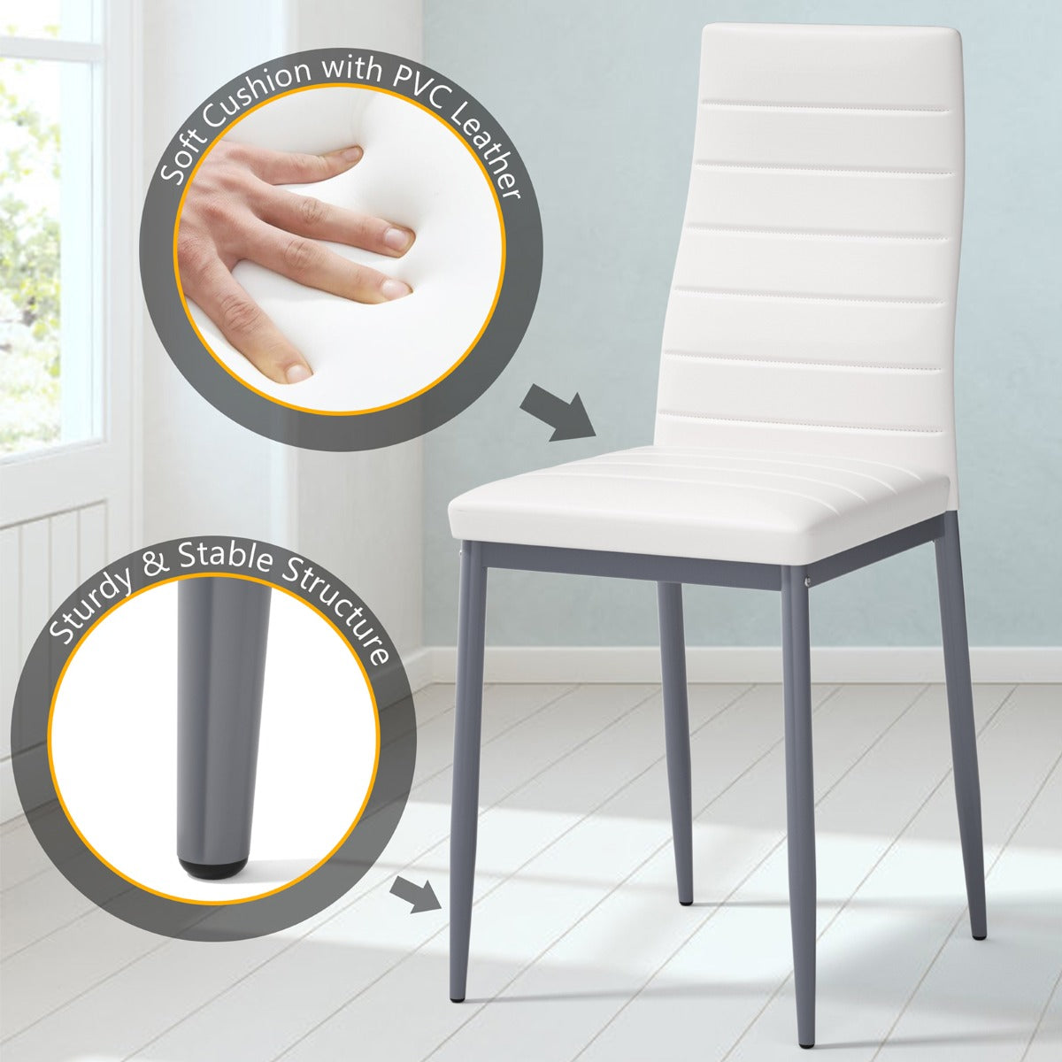 Comfortable Ergonomic Chair: Featuring high backrest, the chair can fully support your back during your dining time. Four contemporary upholstered dining chairs are covered by premium PVC leather, giving you more comfortable skin contact and sitting experience. The thick cushion has high resilient to work for a long time without deformation.