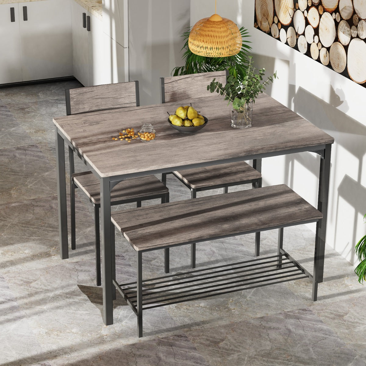 Our 4-piece modern dining table set is an ideal addition to your home for family gathering and friend get-together. Comes with a spacious table, a large bench and 2 ergonomic chairs, this kitchen dining set allows 4 persons to sit together. Comes with durable MDF and sturdy metal frame, this table set ensures high stability and long-term use. Its industrial style can match with different indoor decorations. Also, this modern set can be used as a working desk in the study room and a dresser in the bedroom, which can meet all your needs. Besides, the chairs and bench can be tucked under the table, which is ideal for limited living space to use. In a word, this kitchen table set provides you with both practicality and attractiveness.