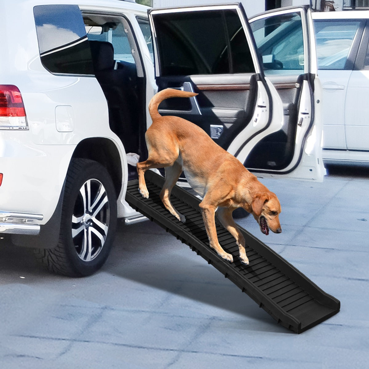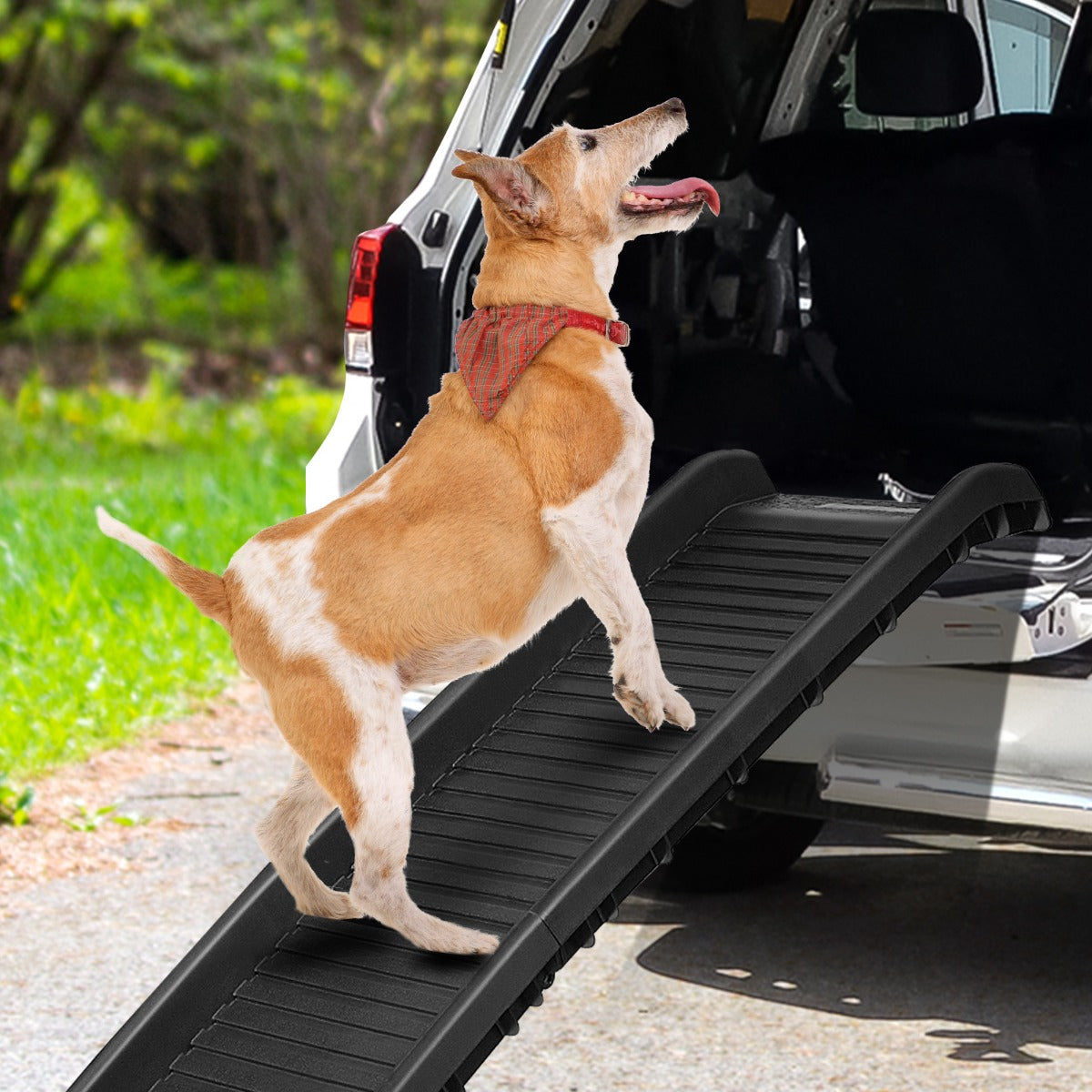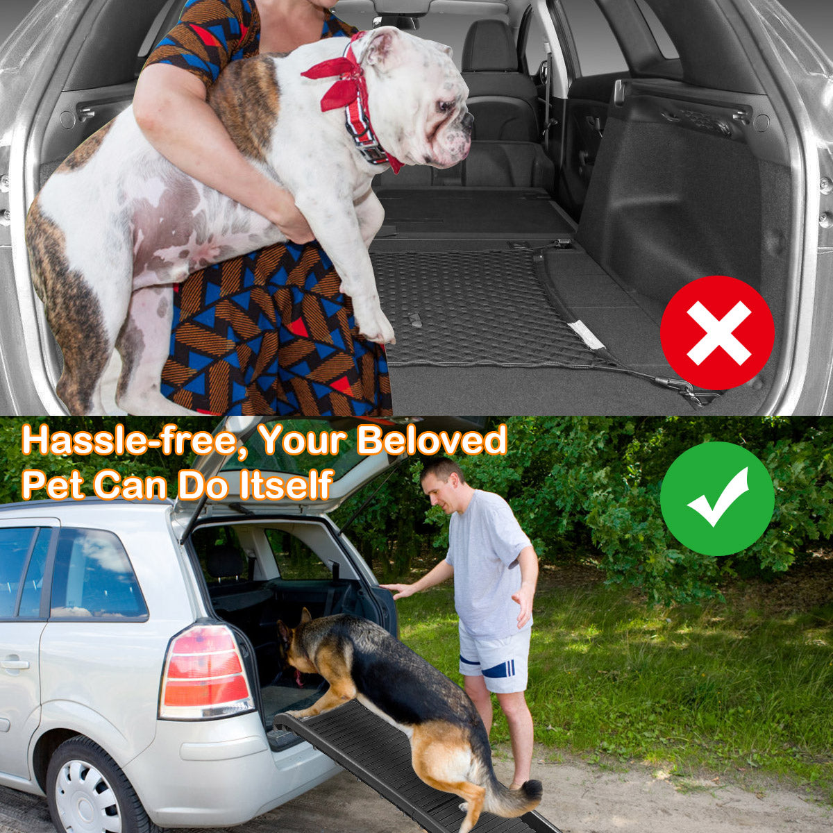 Ready to Go: With the folding pet ramp, you can commence adventurous journey with your best friend. They can easily get in or out of your car, minivan or SUV all by themselves, no longer worrying about their safety for being alone at home.