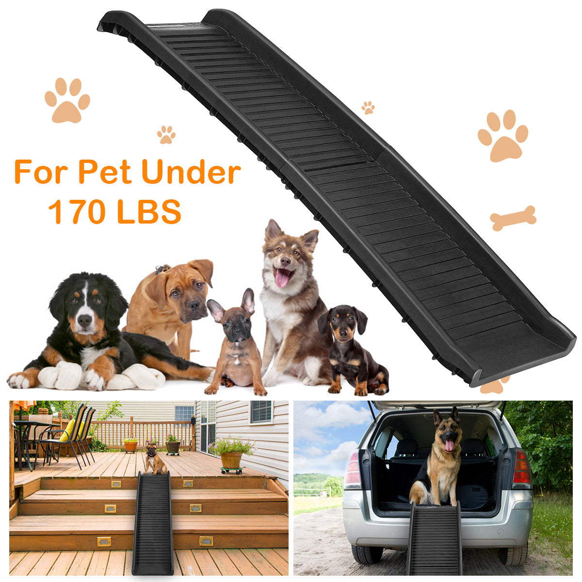 Heavy-duty Construction with Maximum Traction: Made of durable and high quality PP material, this portable dog ramp is stable enough to hold up to 75kg, providing a safe walking high traction surface for even the largest dogs/cats. Also, 4 non-slip foot pads provide extra stability.