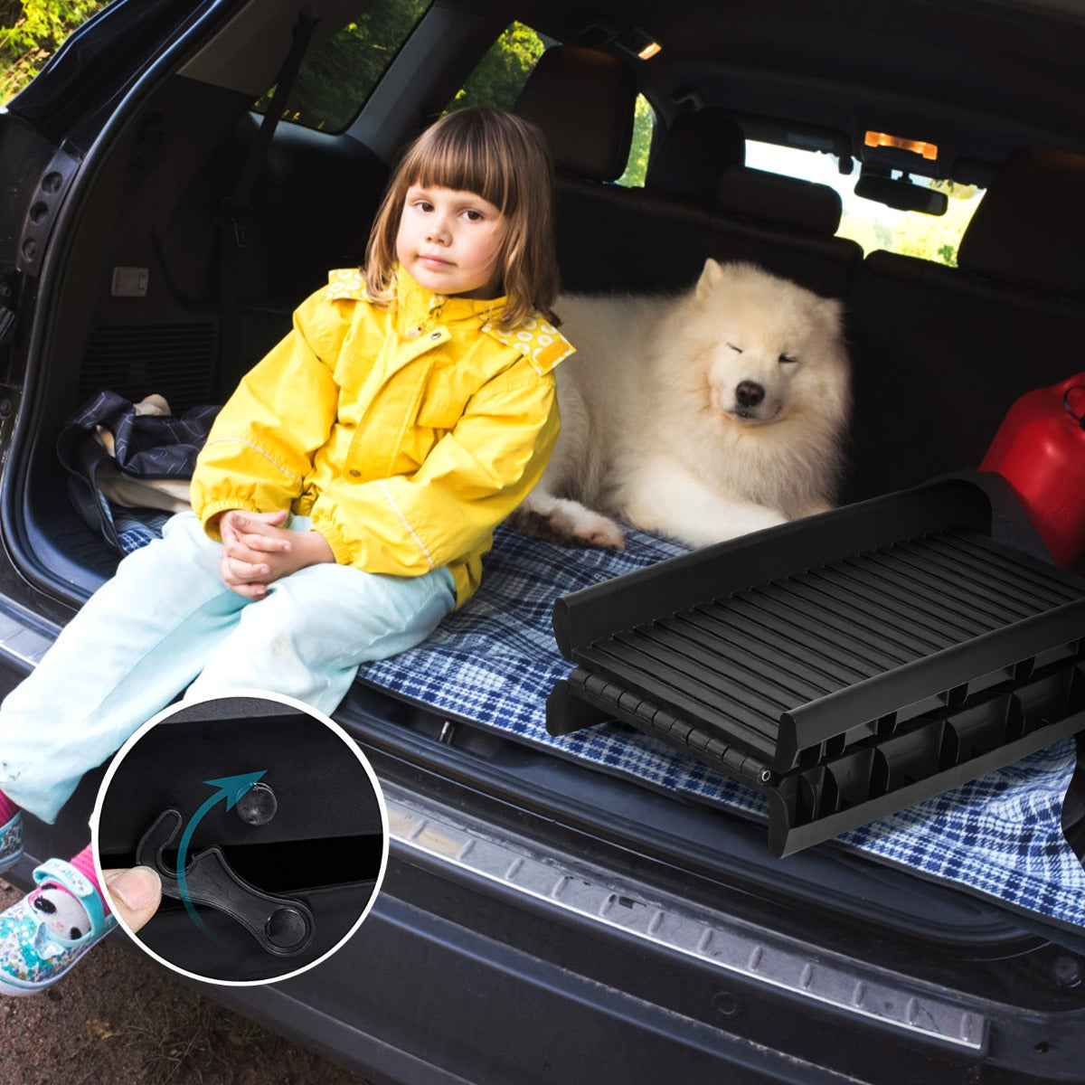 The foldable design makes our pet ramp easy to carry and store. When going out, you can easily put it in the trunk. The anti-slip surface with high traction ensures your pets' safety, so that they can reach a steep place steadily. The pet ramp is made of durable PP material and weighs only 4.2 kg, but can withstand large pets up to 75 kg. Equipped with a safety release latch, our foldable dog car ramp can reduce potential safety hazards.