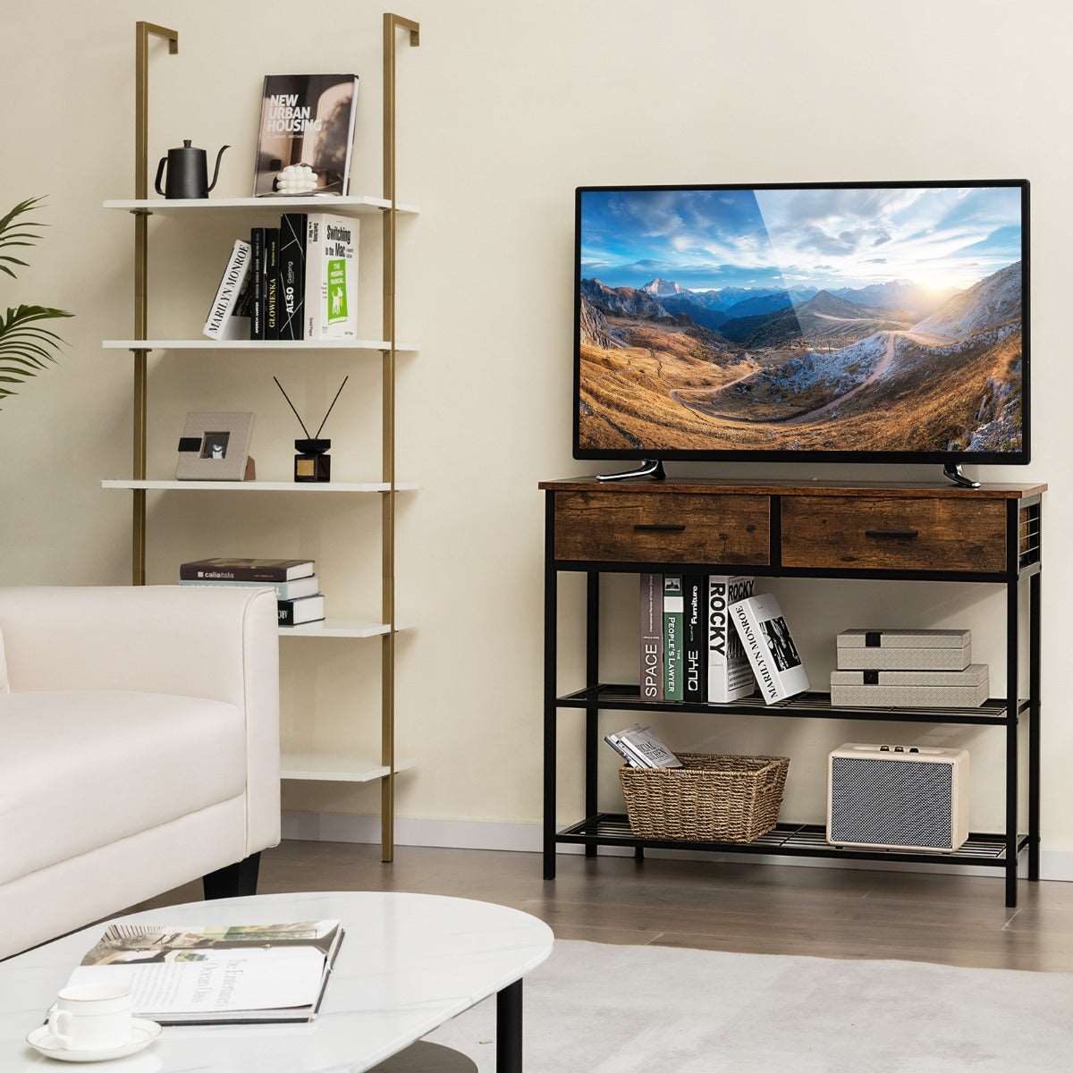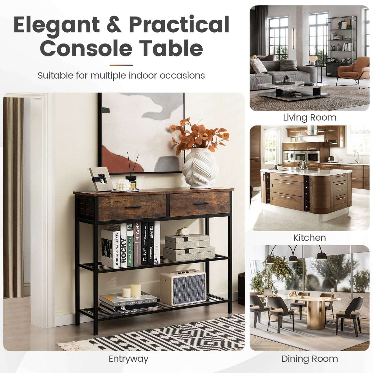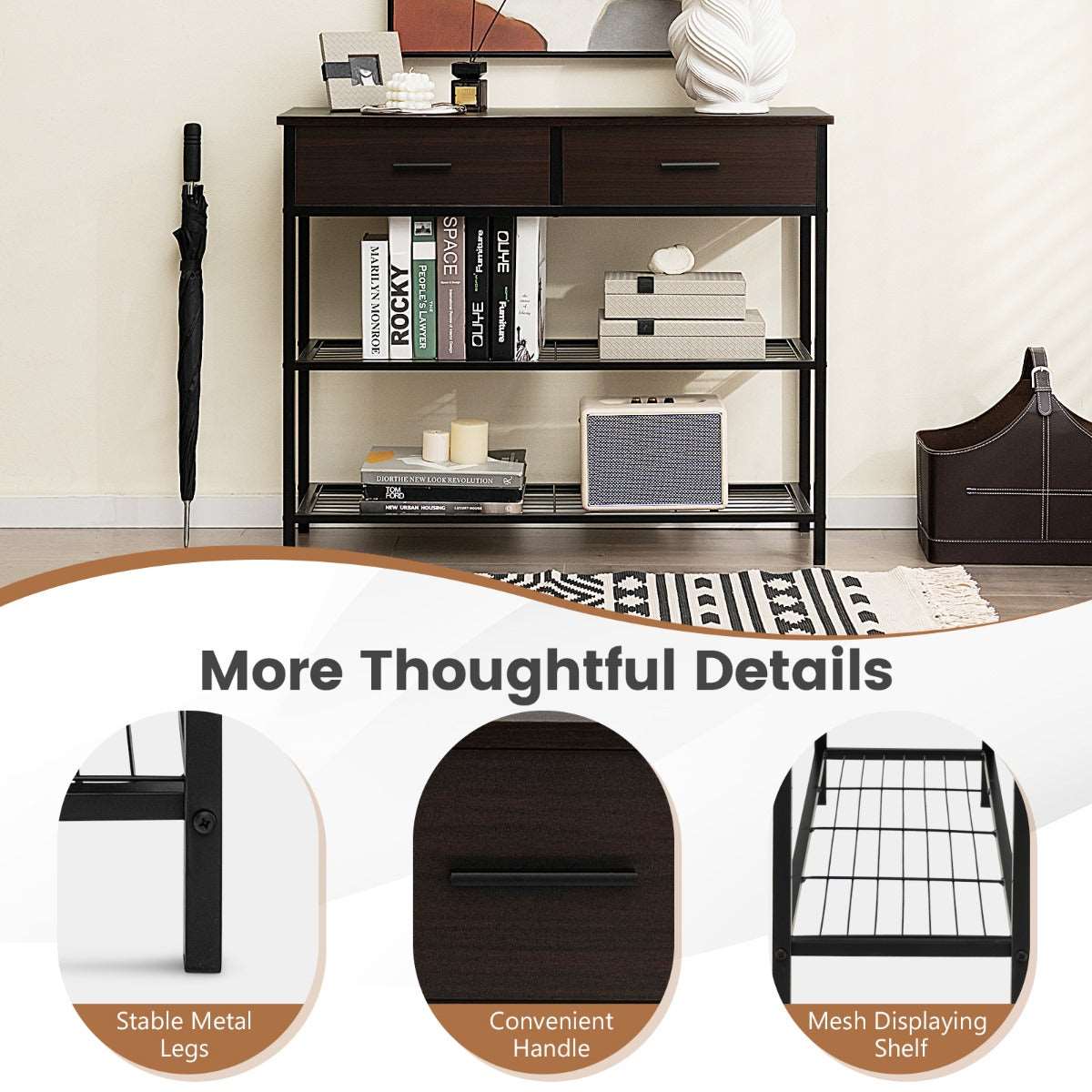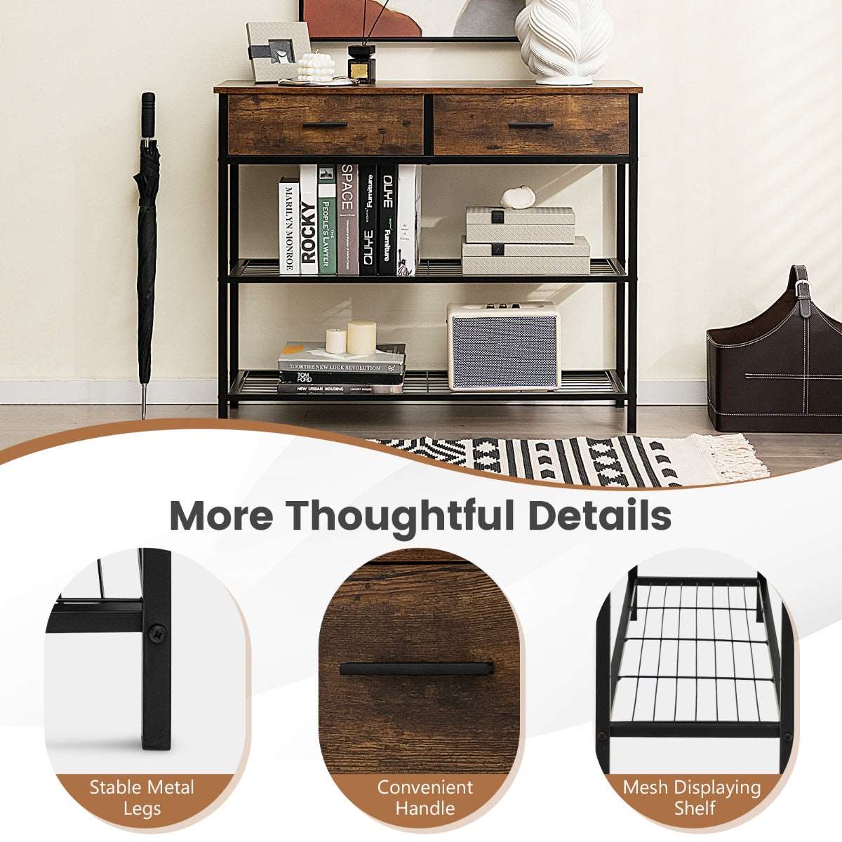 Spacious & Classified Storage: With a 100cm tabletop, 2 large drawers and 2-tier metal shelves, this console table will provide you with ample storage space. The tabletop and 2 metal shelves are perfect to display decorations and store frequently used items. And the 2 drawers offer the ideal place to store private items.