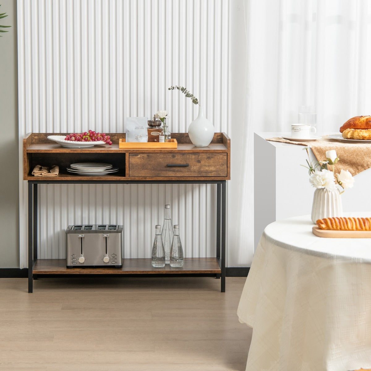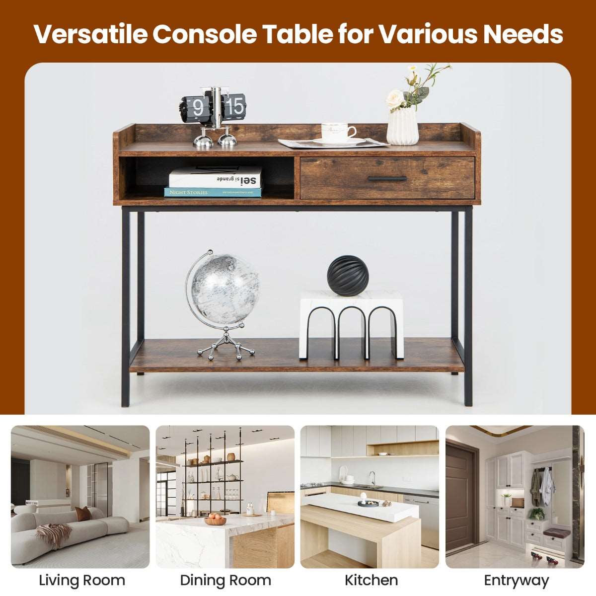 The industrial console table can meet various needs! The metal frame offers you a strong load capacity, while its anti-tipping kit avoids sudden toppling. As for storage, the couch side table with anti-slip pads has a wide tabletop, a large drawer and open shelves. Especially the tabletop is designed with an elevated edge to keep items in place. It only requires a simple installation. Then you can place it in the living room, dining room, entryway, etc.