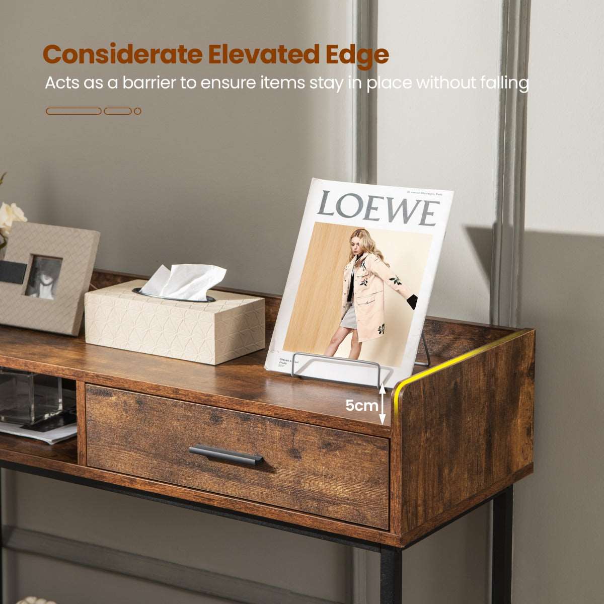 Space Ideal for Display: The 100cm x 35cm (L x W) tabletop features a 5cm high elevated edge, working as a protector to keep collections in place without falling. More, the console table also has a 43cm x 29cm x 8cm (L x W x H) drawer and an open shelf. One ensures privacy and the other allows for easy access to commonly used items.