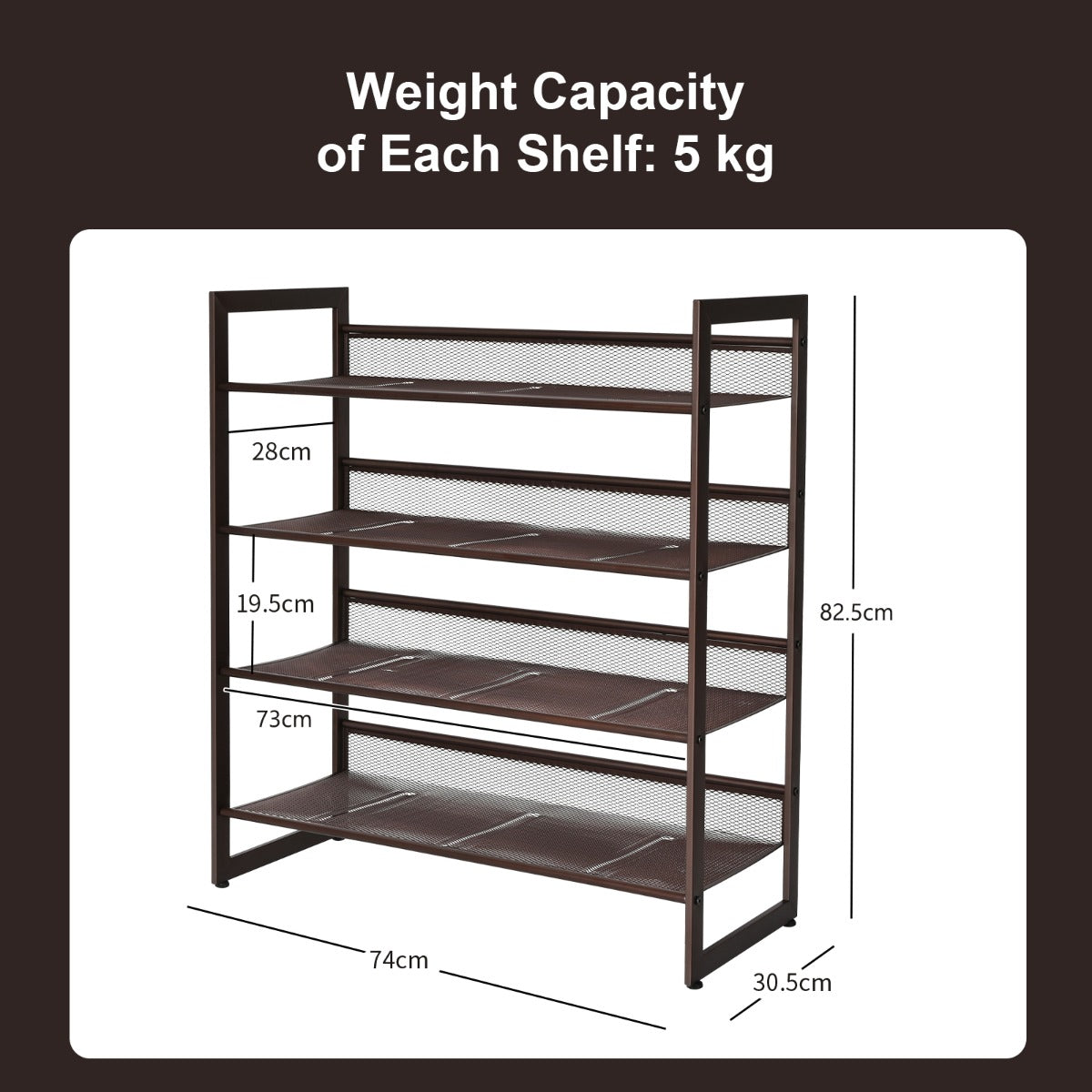 Ample Storage Space: The shoe rack is designed with 4 tiers to meet your placement need. And the interval of each tire is 19cm, which is practical for users to place different items while saving storage space. What's more, the shoe rack can help you find the shoes you want quickly and effectively.