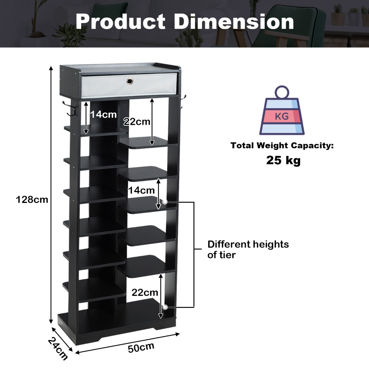 Extra Space: The shoe rack also has a removable drawer in which you can put some small things. You can put some decorations or keys on the upper platform. Besides, there are 2 metal hooks attached to the shoe rack for you to hang an umbrella or other lightweight items.