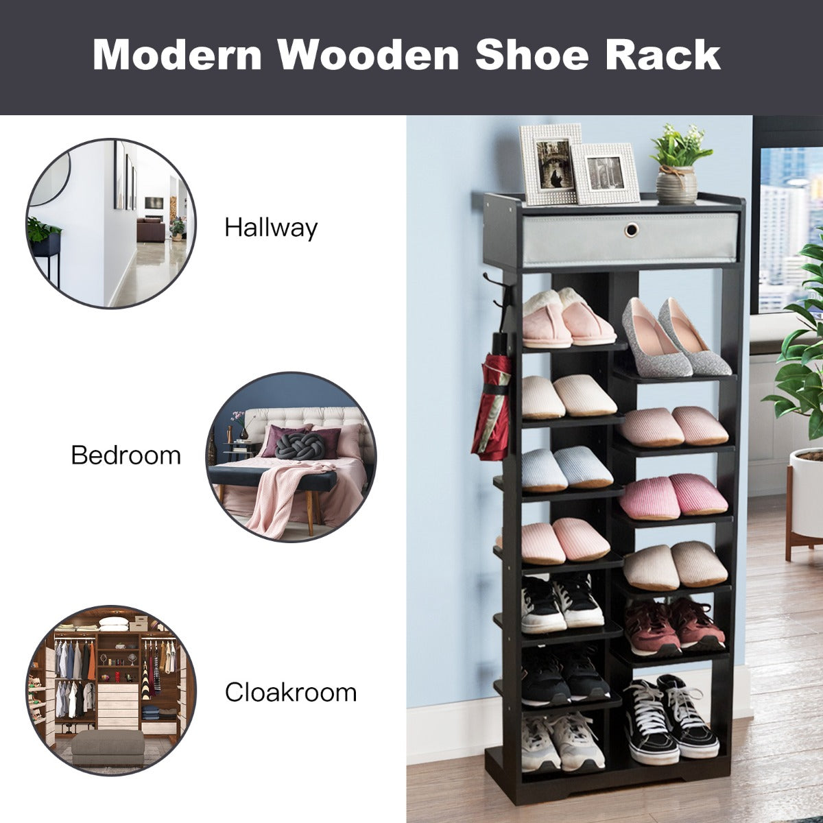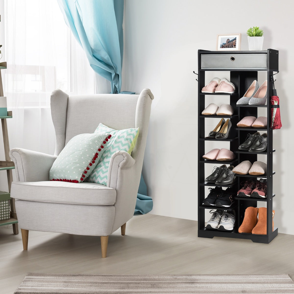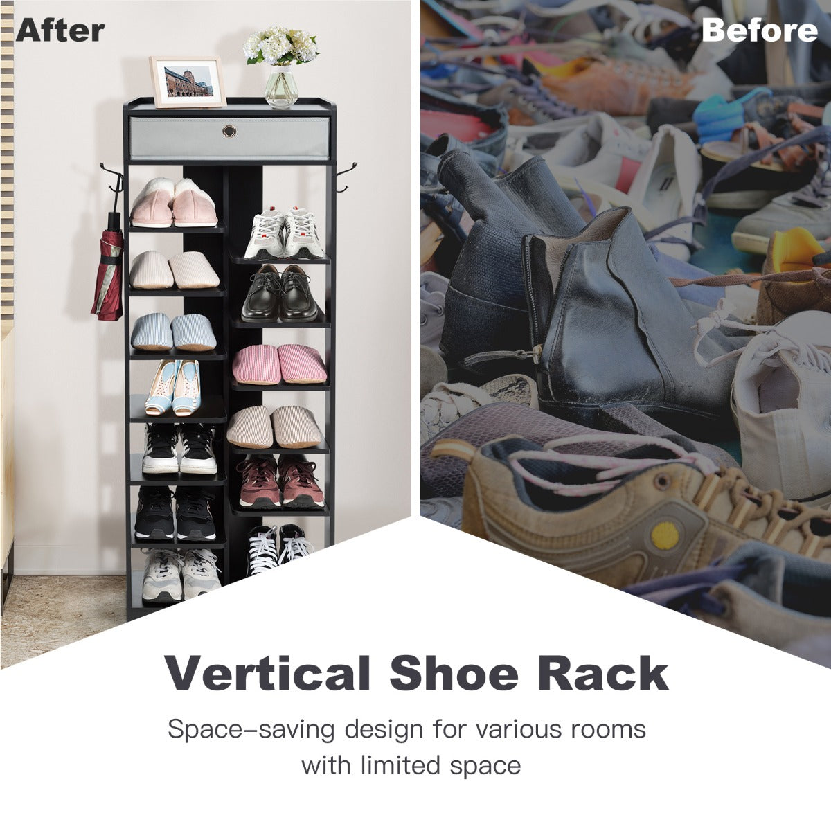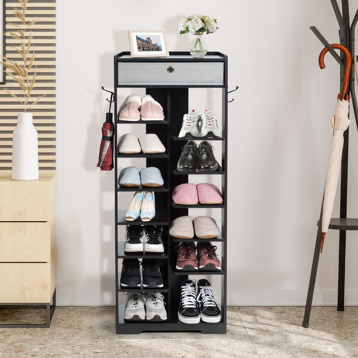 13 tiers of shelves with different heights can meet your different needs, allowing you to put sandals, slippers or high heels on them. The removable drawer and the hooks on both sides offer additional space for your sundries and grab-to-go items. And the high-quality MDF ensures the stability and durability of the shoe rack. No matter where you place it, it will impress you with great functionality and an attractive appearance.