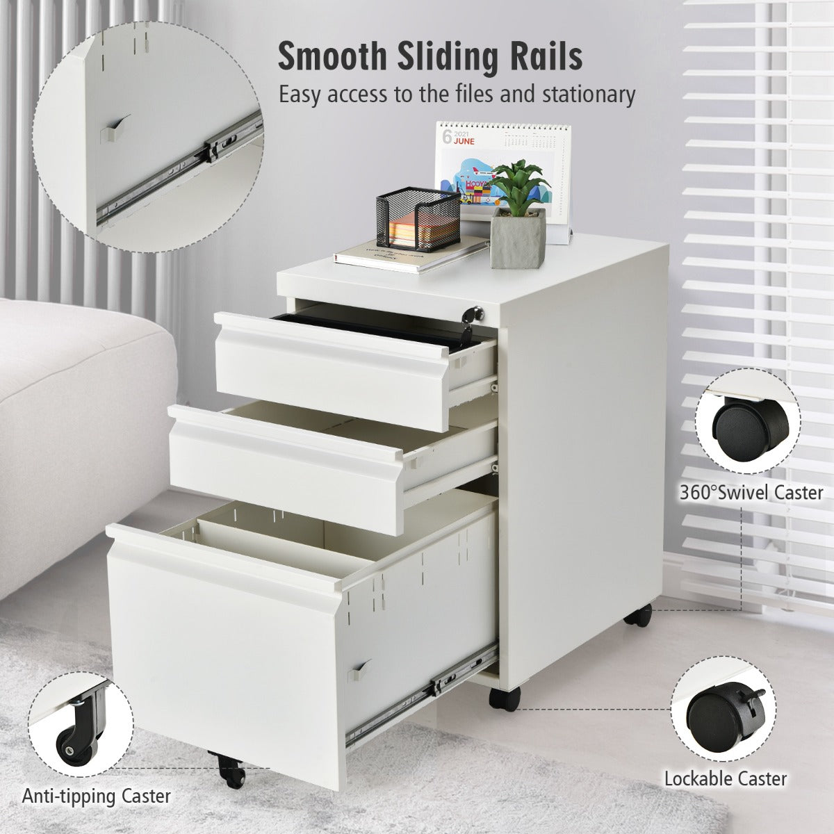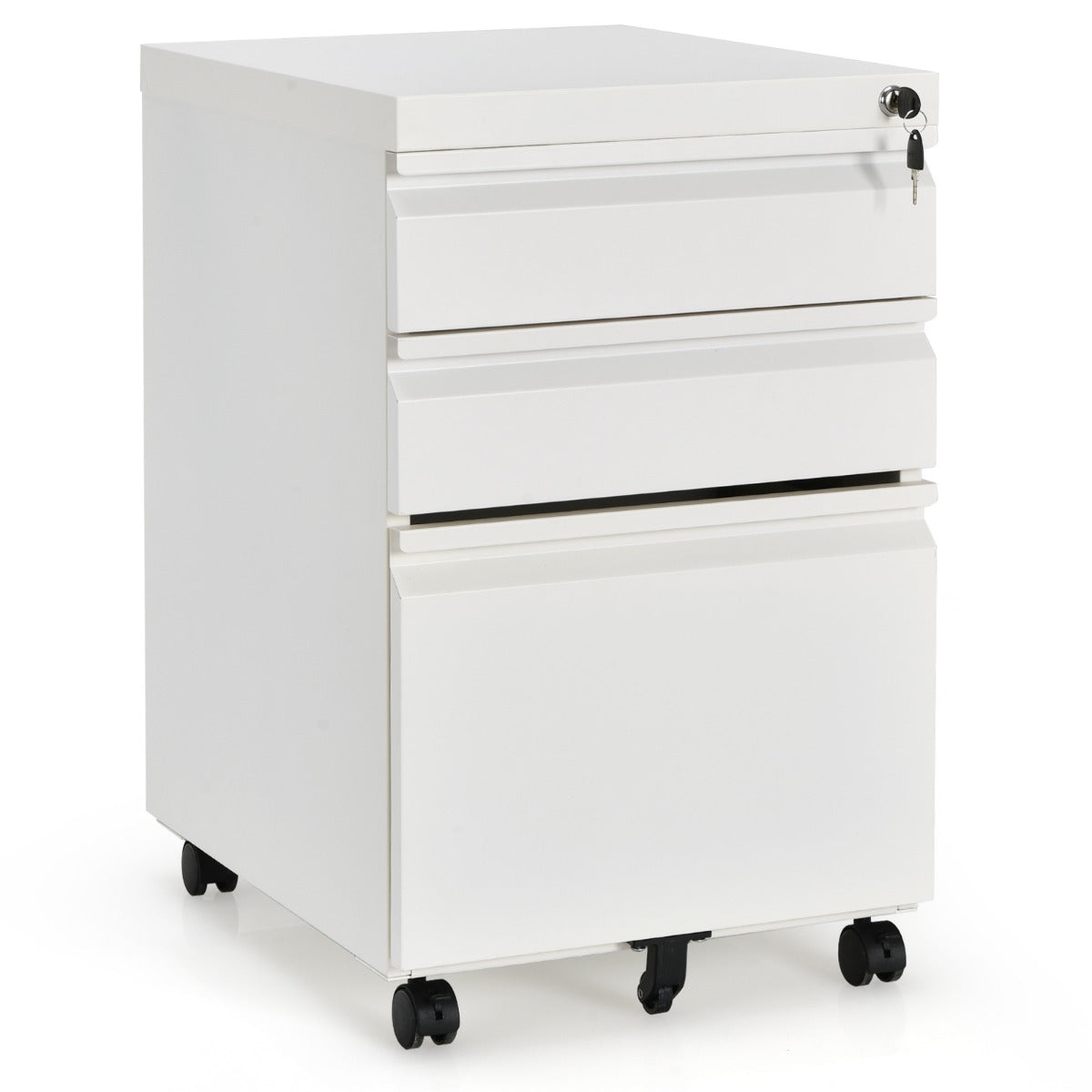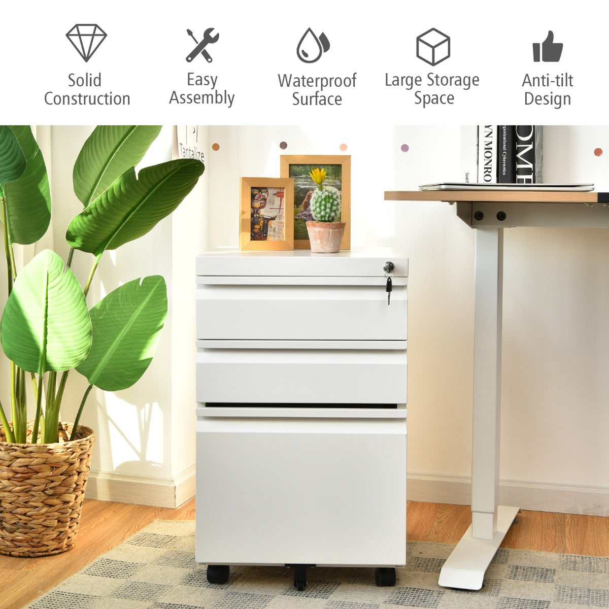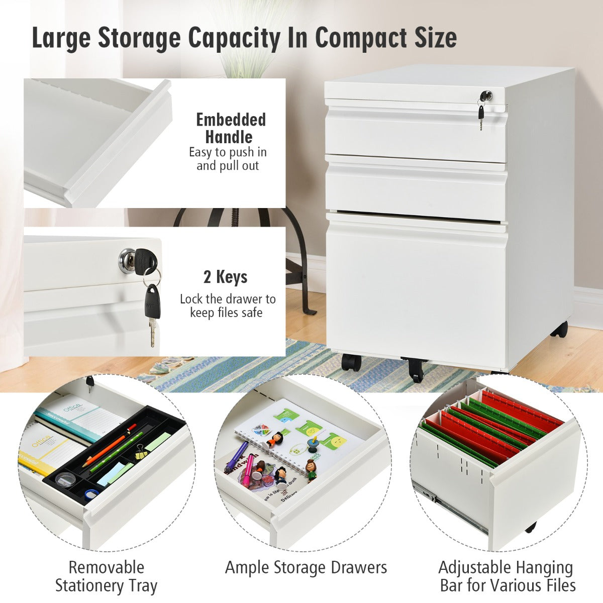 If you are looking for a practical file cabinet to be placed in your home or office, this filing organizer is just what you need. Constructed of a heavy-duty steel frame, the file cabinet is sturdy and durable enough for long-term use. This file cabinet is designed with 3 drawers to facilitate convenient storage for multiple office supplies. A deep drawer with an adjustable hanging bar is adapted to store letter-size, legal-size and A4 files. The removable pencil tray makes the desktop tidier. It also comes with two keys to ensure the privacy and safety of documents. Equipped with 5 smooth-rolling casters, this file cabinet is easy to move anywhere you need. It is designed with a modern and concise look that perfectly decorates your home or office. The file cabinet will make you feel easier at work.