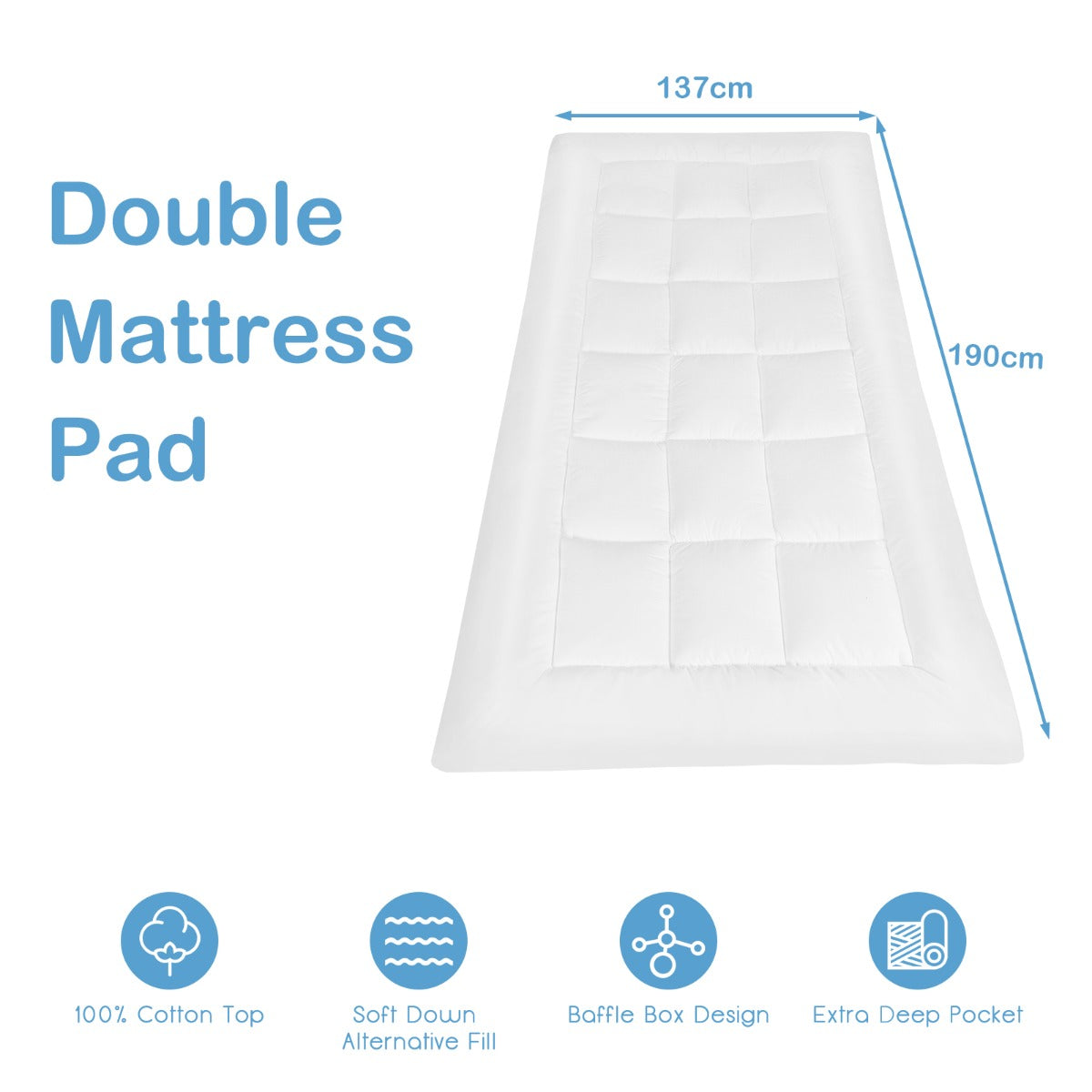 With cotton jacquard fabric top and down alternative filling, our mattress pad cover has excellent ventilation and heat circulation to help regulating body. The Single/ Double/ Queen/ King mattress protector can protect your mattress from stains and sweat, thus prolong its lifespan. temperature. The quilted fitted topper with baffle box structure is more durable than normal diamond quilted seam. And the considerate elastic deep pocket can be stretched 53 cm to fit various mattress. So you can twist on the bed without extra worries. There's no doubt that you will have a good dream on this mattress pad. The mattress pad is safe for washing machine, providing convenience for daily maintenance.