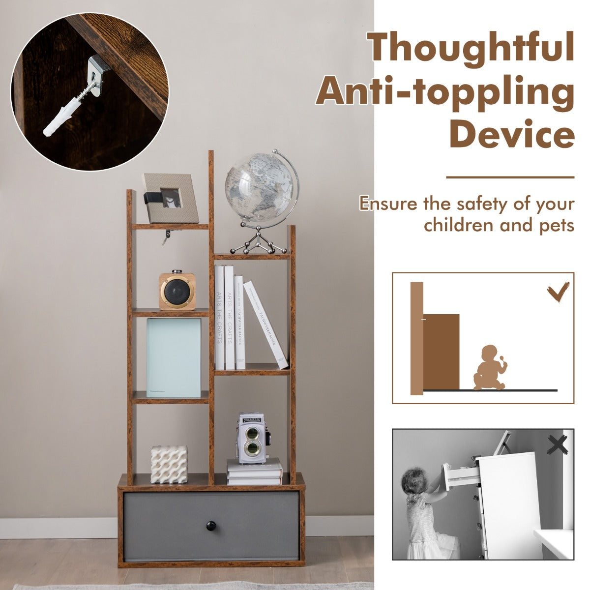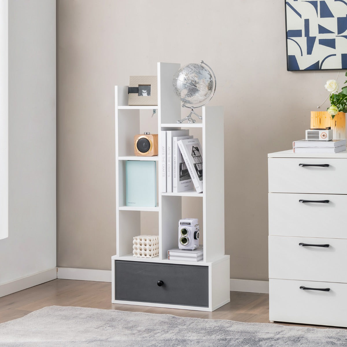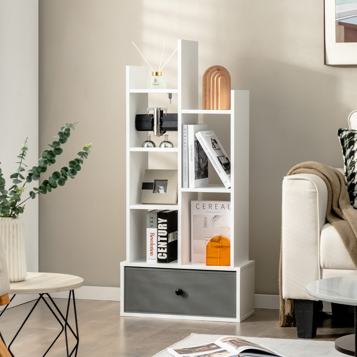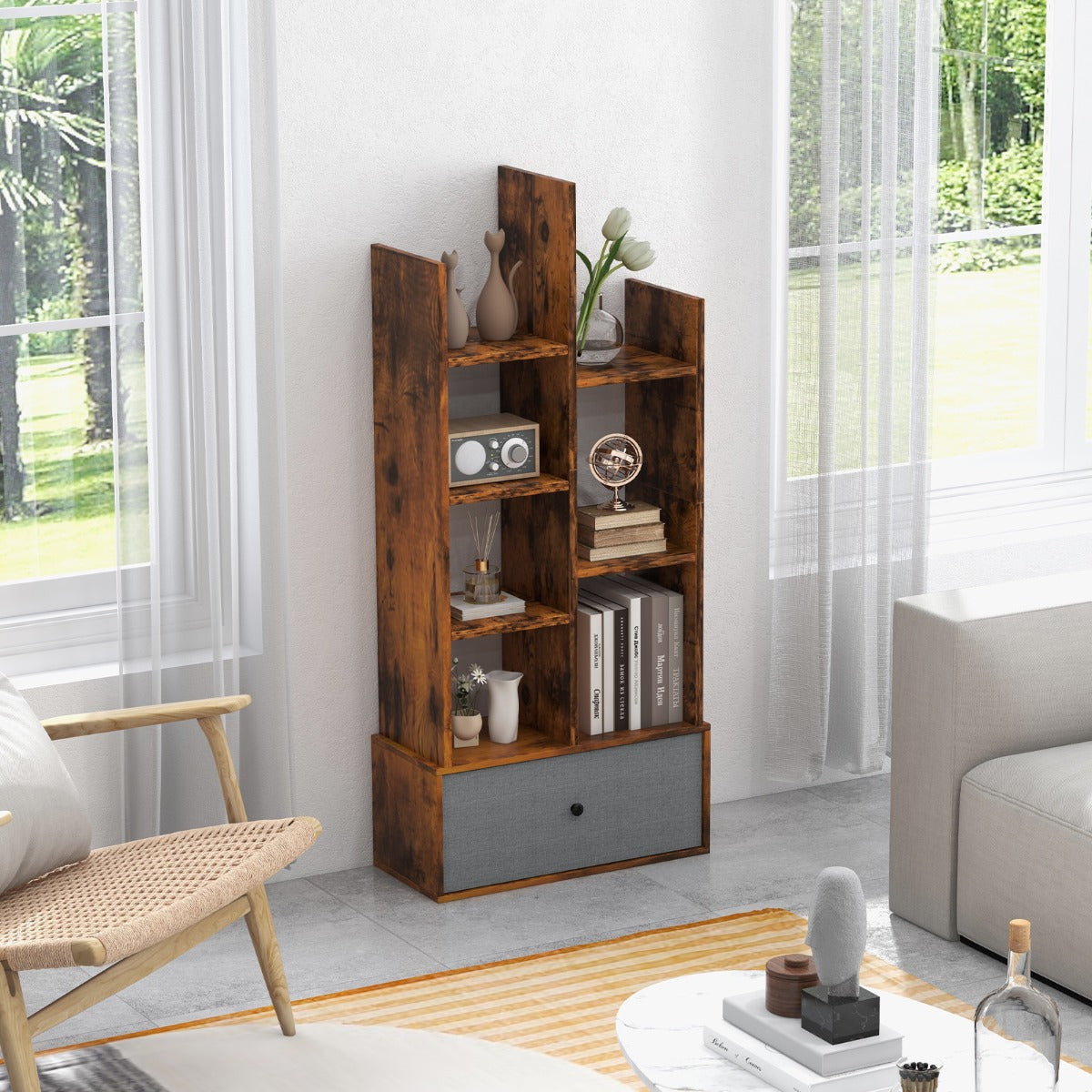 Aussies Market Industrial Bookshelf with Non-woven Drawer& 7 Storage Shelves