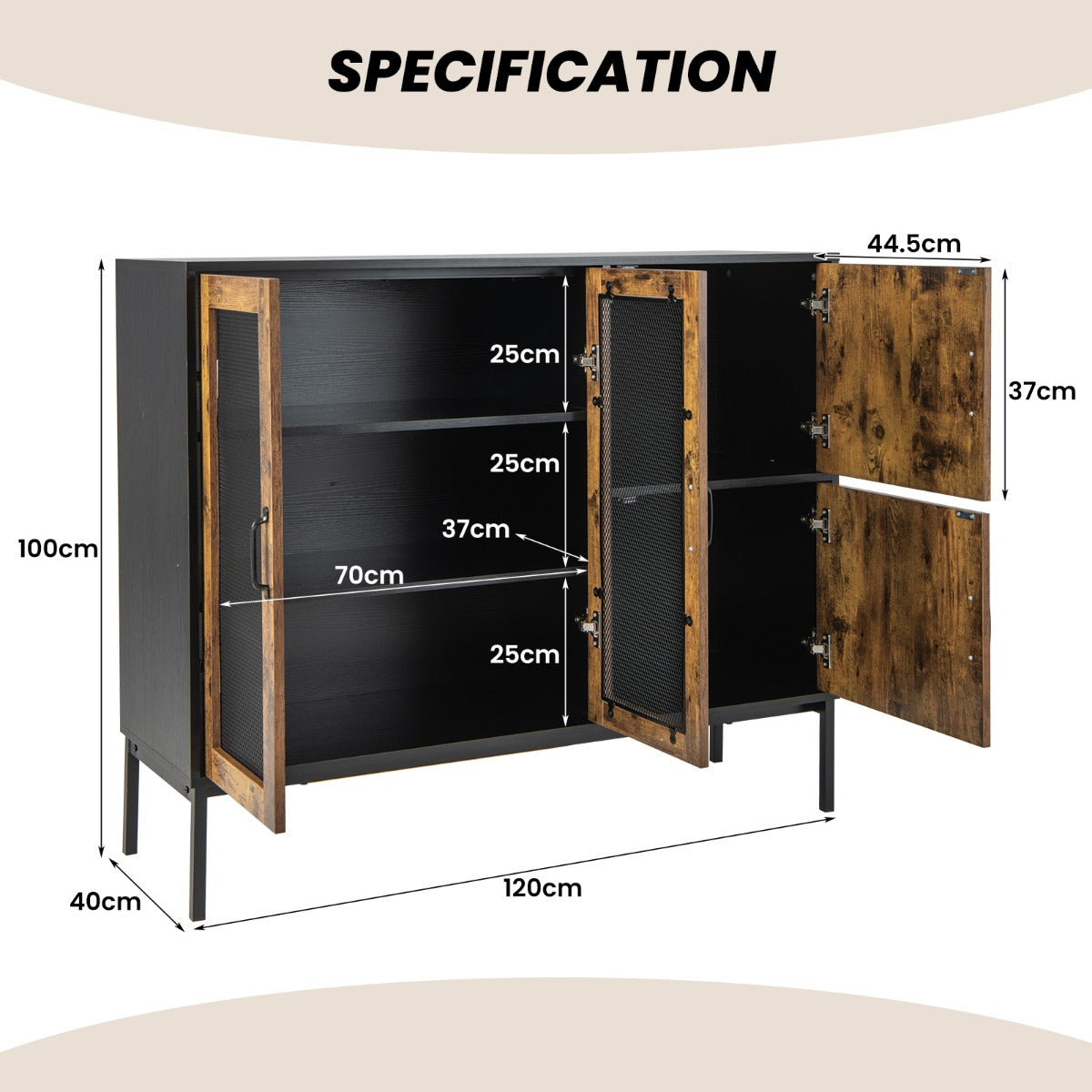 If you are looking for a versatile yet sturdy storage cabinet to keep your stuffs clean and tidy, our buffet sideboard is your great option. Spacious cabinet top and 4 concealed cabinets allow you to store and display kitchen supplies in different sections, which can well suit your storage needs. Moreover, thanks to the anti-toppling device, you can fix the sideboard to the wall to prevent wobbling or tipping over. Metal legs mean higher sturdiness, better durability, and longer life span. This industrial cupboard is a practical storage solution to organize your clutter, whether used as a buffet sideboard, storage cupboard or wine bar cabinet.