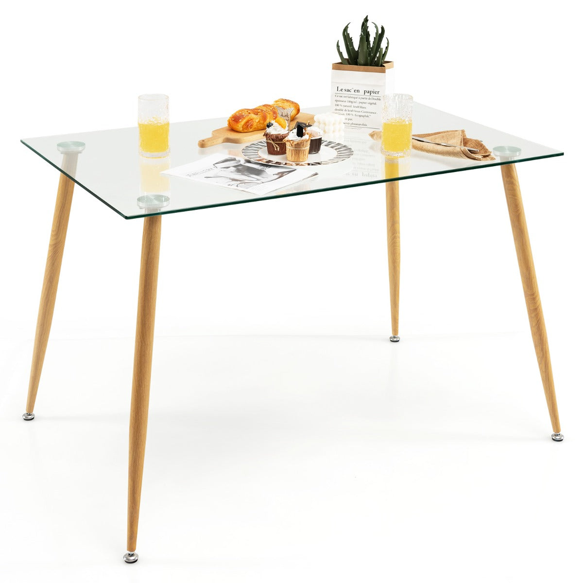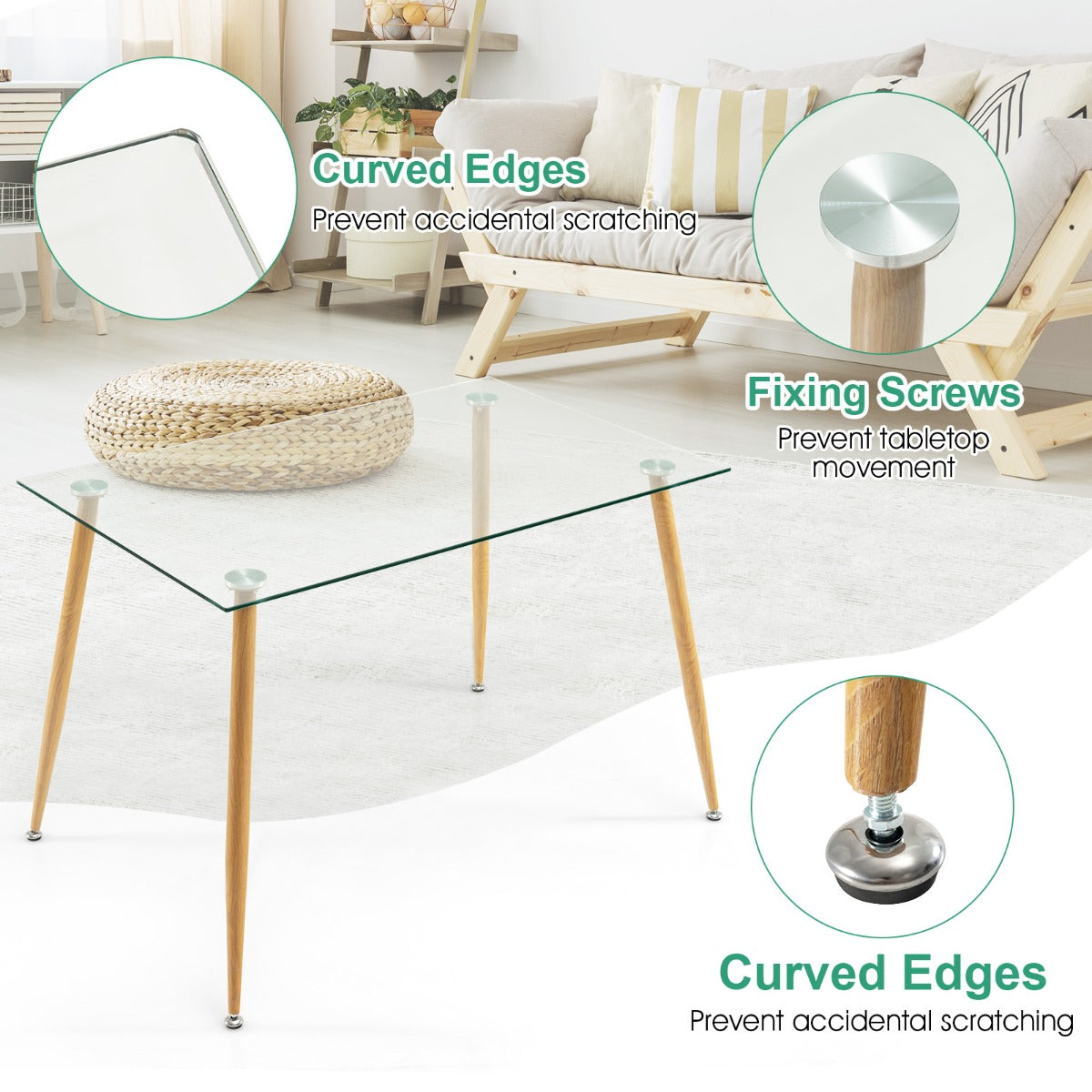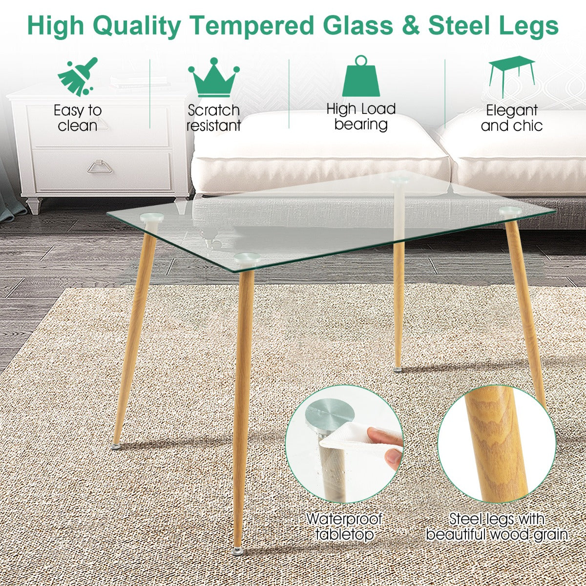 Steel Legs with Wood Print: The glass dining table comes with 4 sturdy metal legs with a wood grain finish that ensures more reliable support while creating a natural appearance. What's more, the table legs are equipped with adjustable foot pads for higher stability on uneven floors.