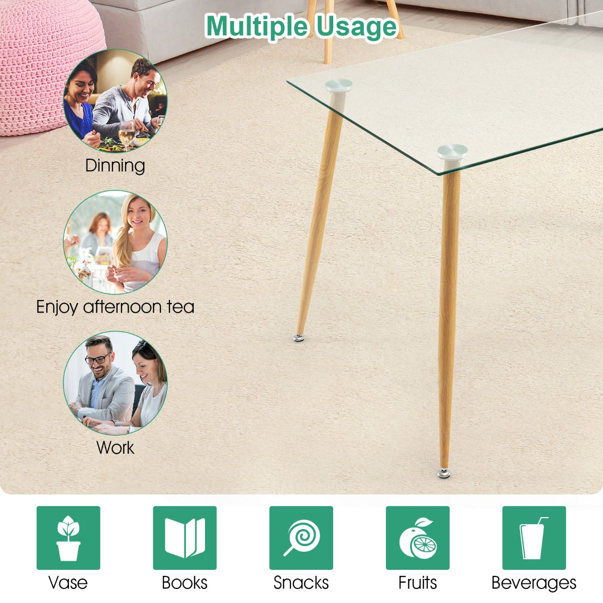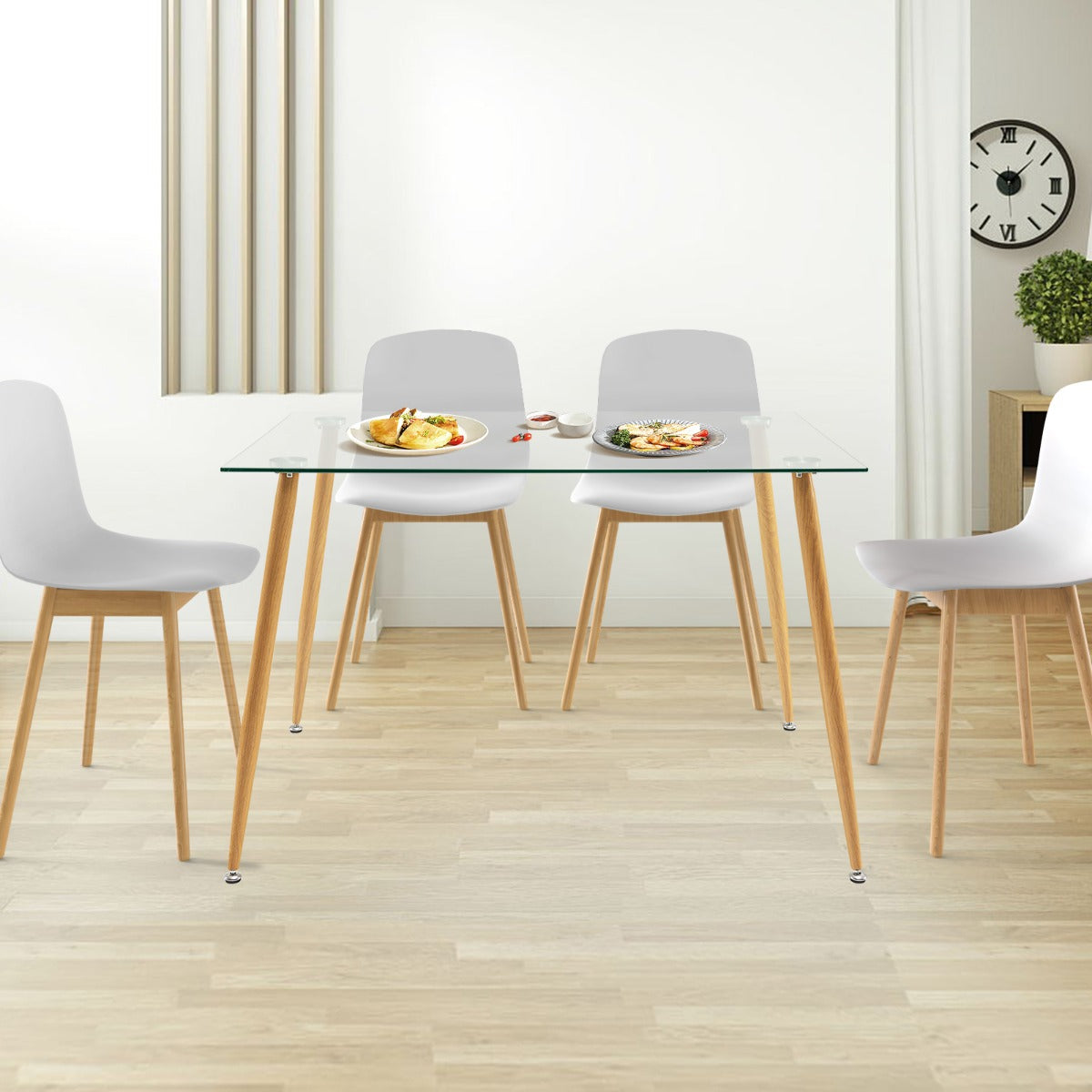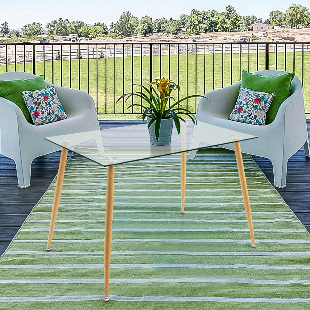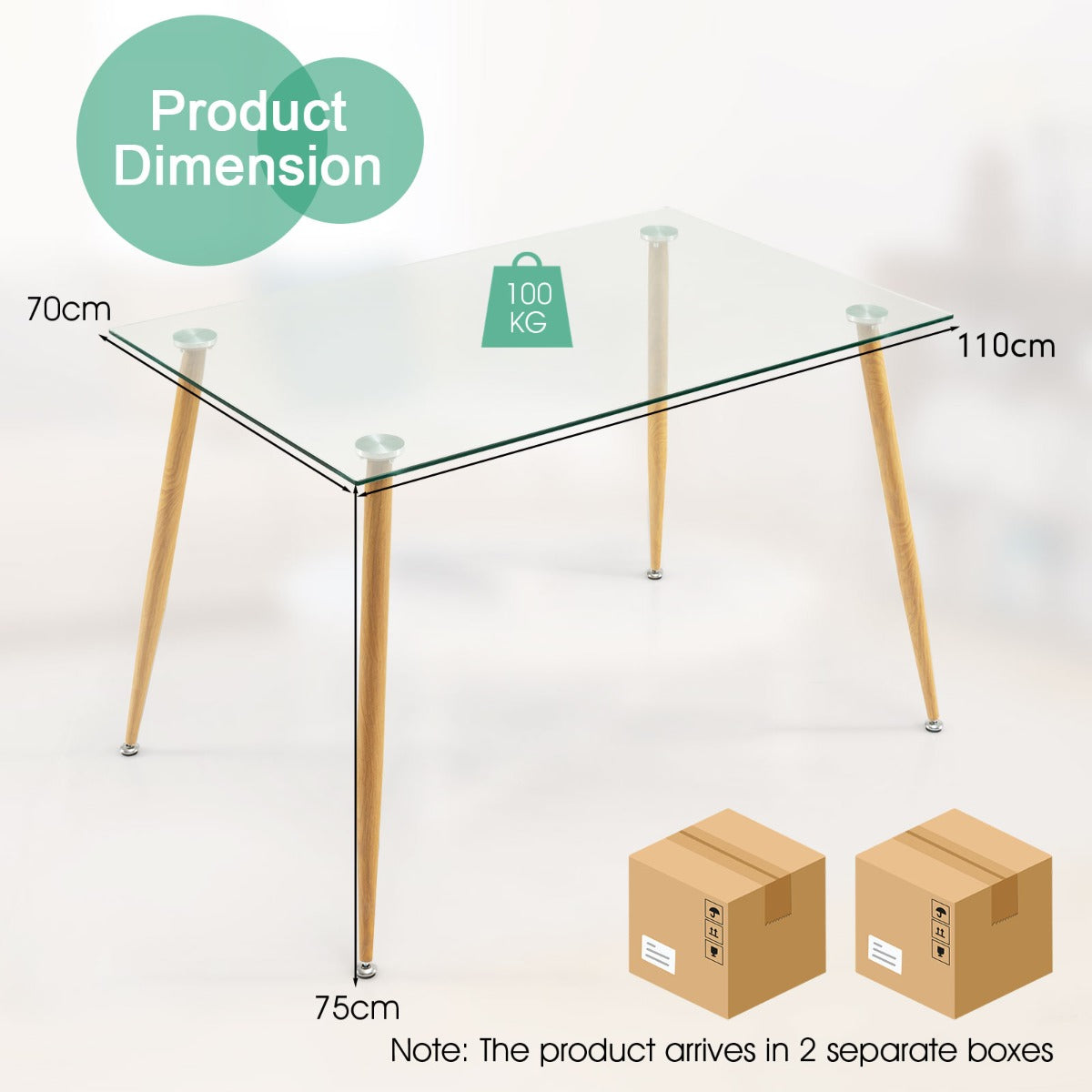 Steel Legs with Wood Print: The glass dining table comes with 4 sturdy metal legs with a wood grain finish that ensures more reliable support while creating a natural appearance. What's more, the table legs are equipped with adjustable foot pads for higher stability on uneven floors.