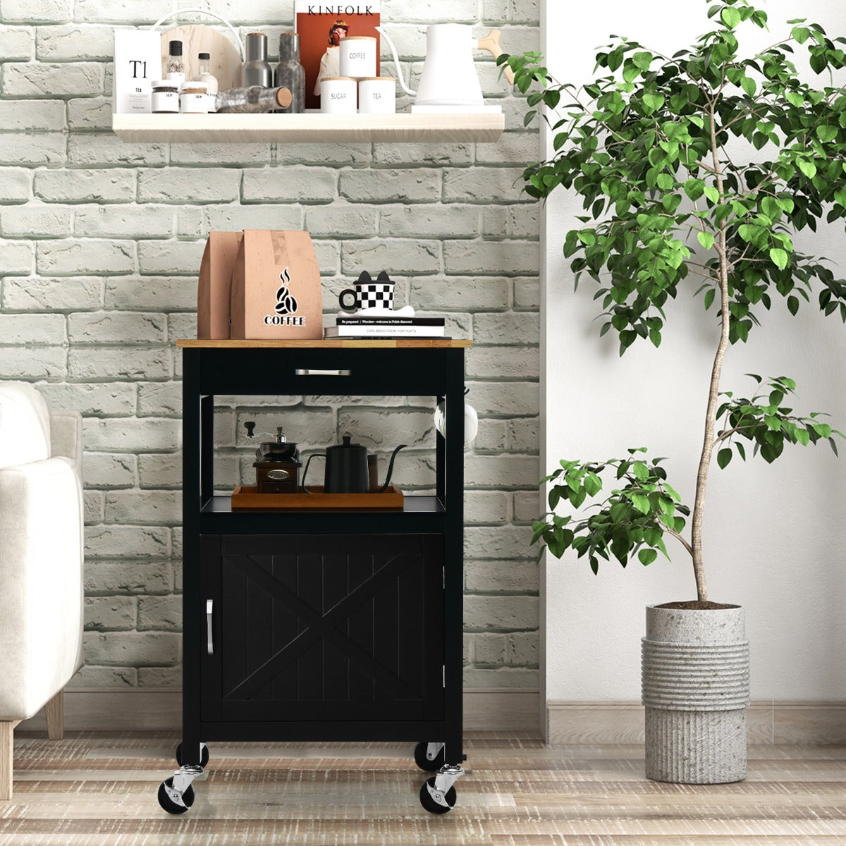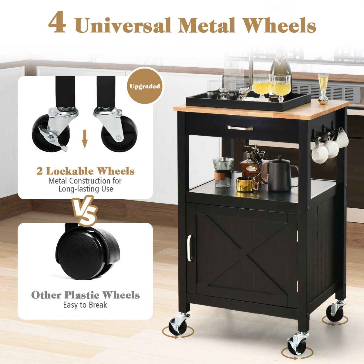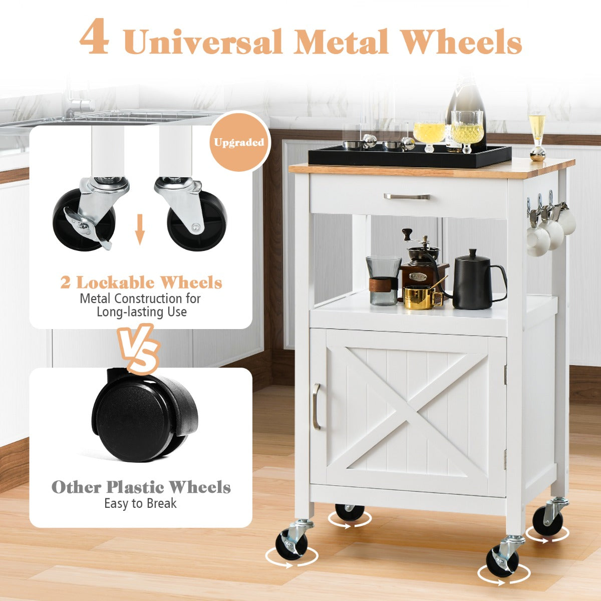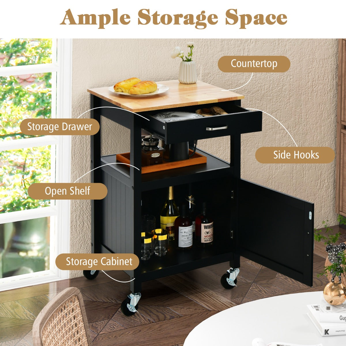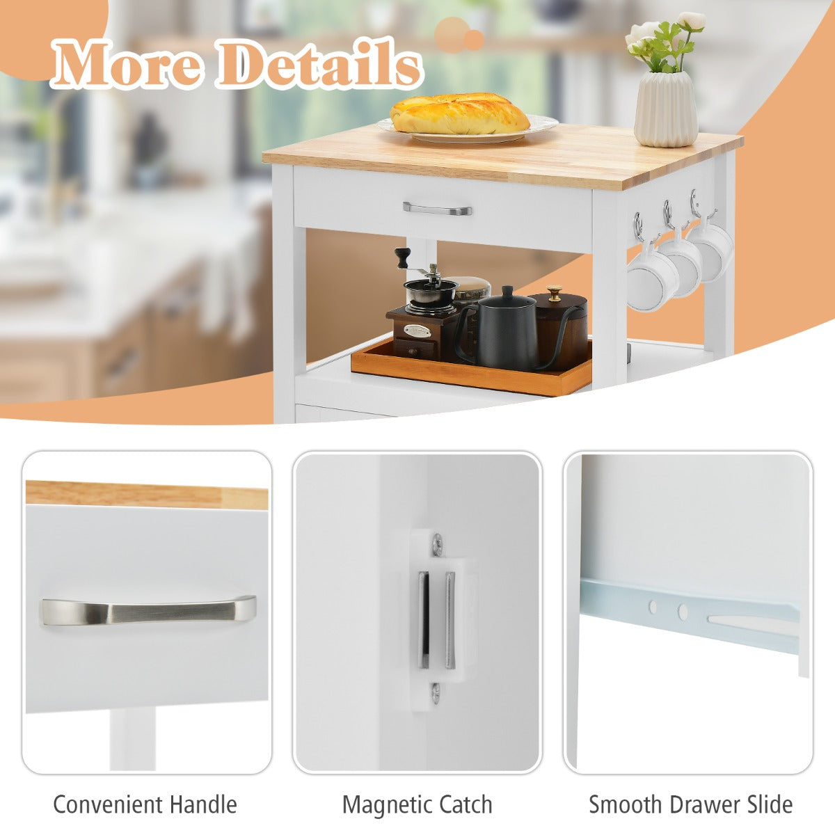 Add extra storage to your home with this rolling kitchen storage island cart! This kitchen cart features a smooth countertop, a drawer, an open shelf, a cabinet and side hooks. These ample storage spaces enable you to organize and store kitchen utensils, spices, tableware, towels, and more. The rubber wood countertop is sturdy and without burrs. The drawer with smooth drawer slides makes it easy to open and close. With handles and a magnetic catch, this storage cart is easy to use. Designed with universal wheels and a lockable design, this rolling kitchen island can wheel around smoothly and keep still when needed. It is a great addition to your home, serving as a kitchen island cart, a coffee bar, a serving cart, etc.