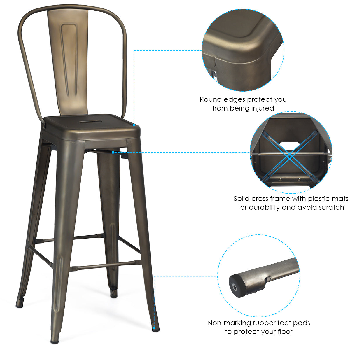 Non-Slip Rubber Feet: The non-slip rubber feet covering the chair legs are designed for a better user experience. Not only do the rubber feet prevent your floors from being worn by the chair legs, but also protect you from falling from the chair because of the smooth floor, which offers an extra safety guarantee.