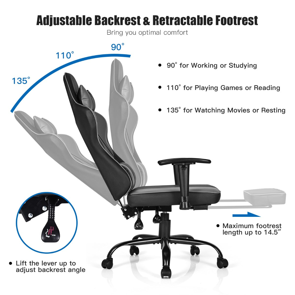 Adjustable Reclining Chair: This gaming chair features multiple adjustable functions to perfectly meet all your needs in daily use. The seat height can be adjusted from 18" to 22" to fit well with people of different heights. Moreover, adjustable backrest (90-135degrees) and armrests allow you to find ideal positions for working, gaming or napping.