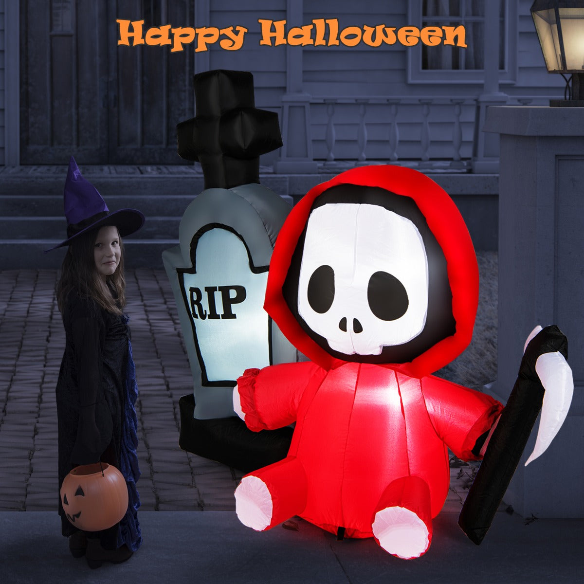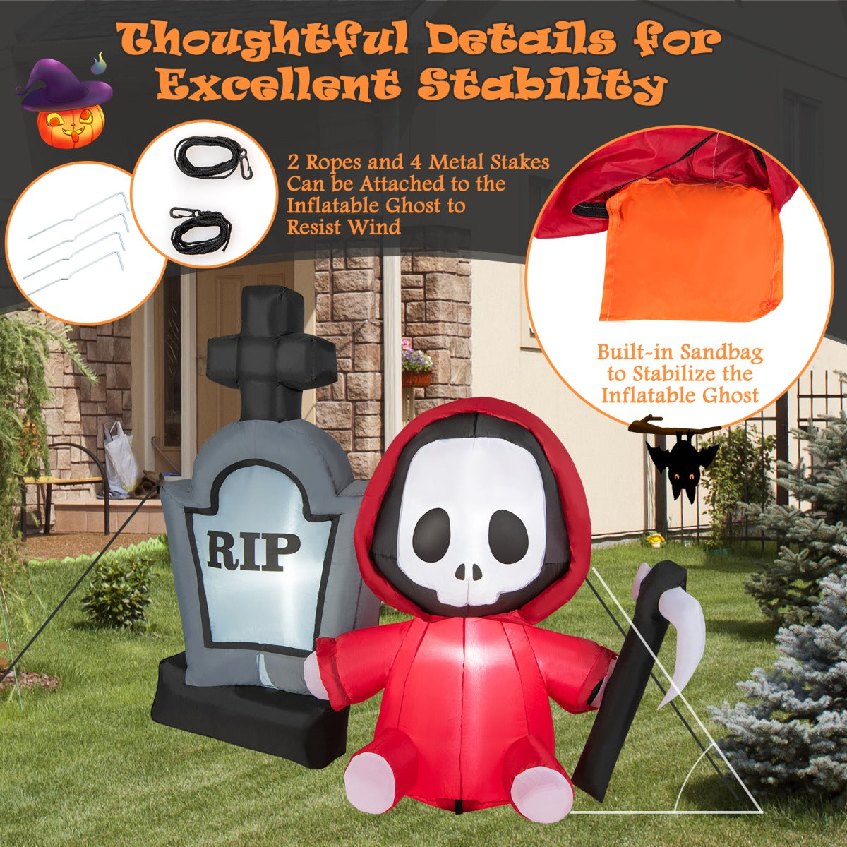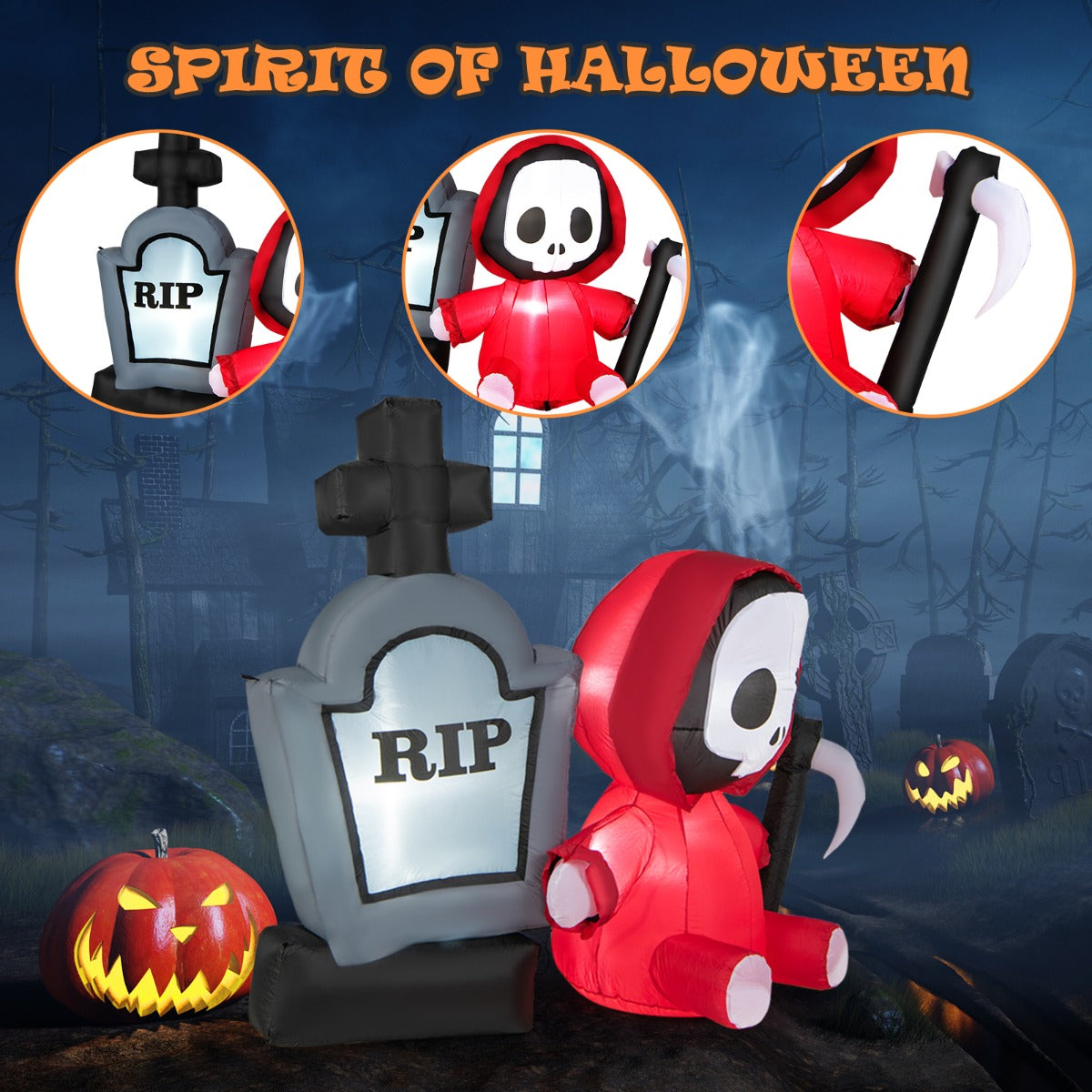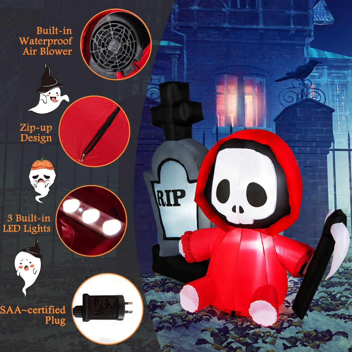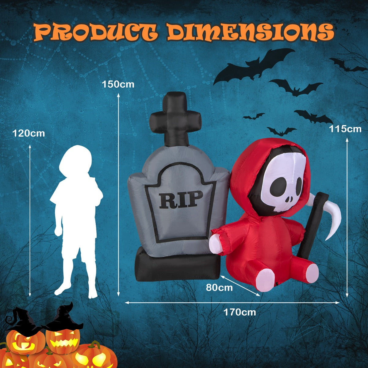 Build a spooky display with this 150cm Halloween inflatable tombstone and grim reaper! It is able to catch all people's attention, creating a scary holiday vibe for your neighbours, guests, and trick-or-treaters. Internal ultra-bright LED lights will give you a...View More