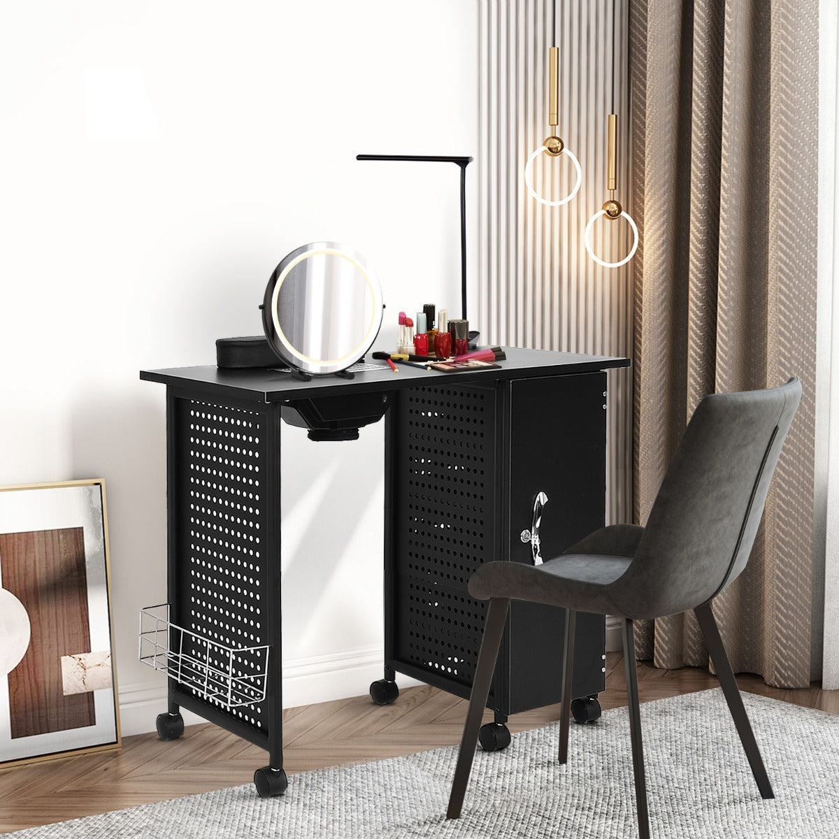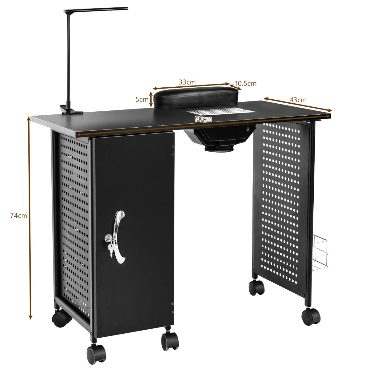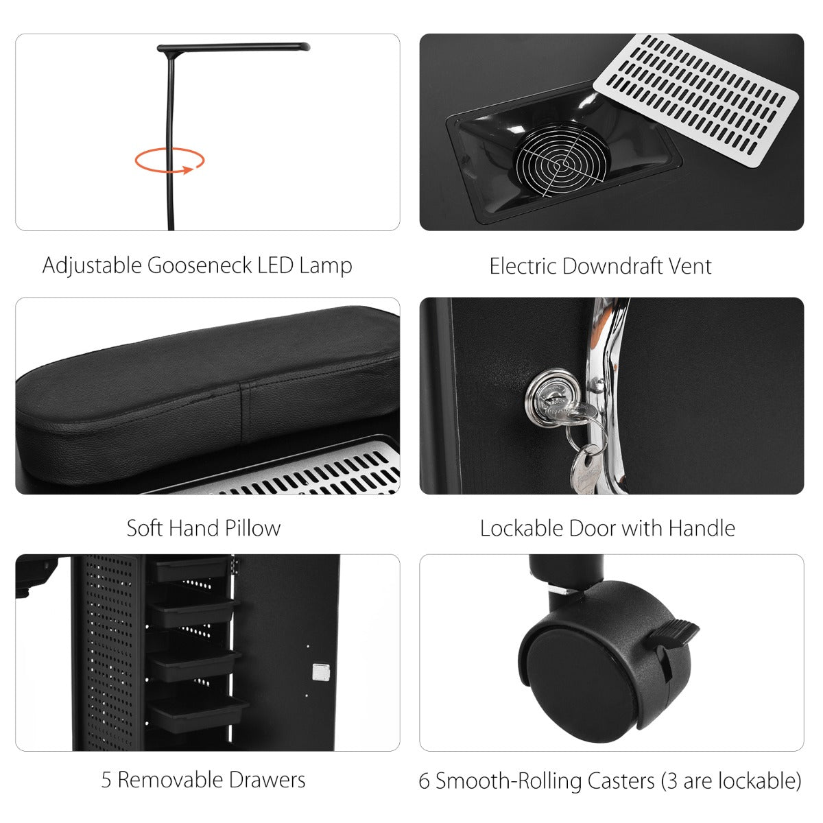 Built with sturdy steel and premium MDF, this classic black nail table ensures lasting usage, great stability and durability. The cabinet with 5 removable drawers provides you with ample storage space for keeping your items in the order. Equipped with a safety lock, this storage cabinet can protect your stuff and also prevent kids from opening it by accident. The electric downdraft vent can reduce dust and suck away chemical odours. Soft twist cushions and bright lamps offer you a better nail beauty experience. You can effortlessly move the table as needed and stop it with the brake. Our functional nail workstation is perfect for personal use and a professional mobile salon.