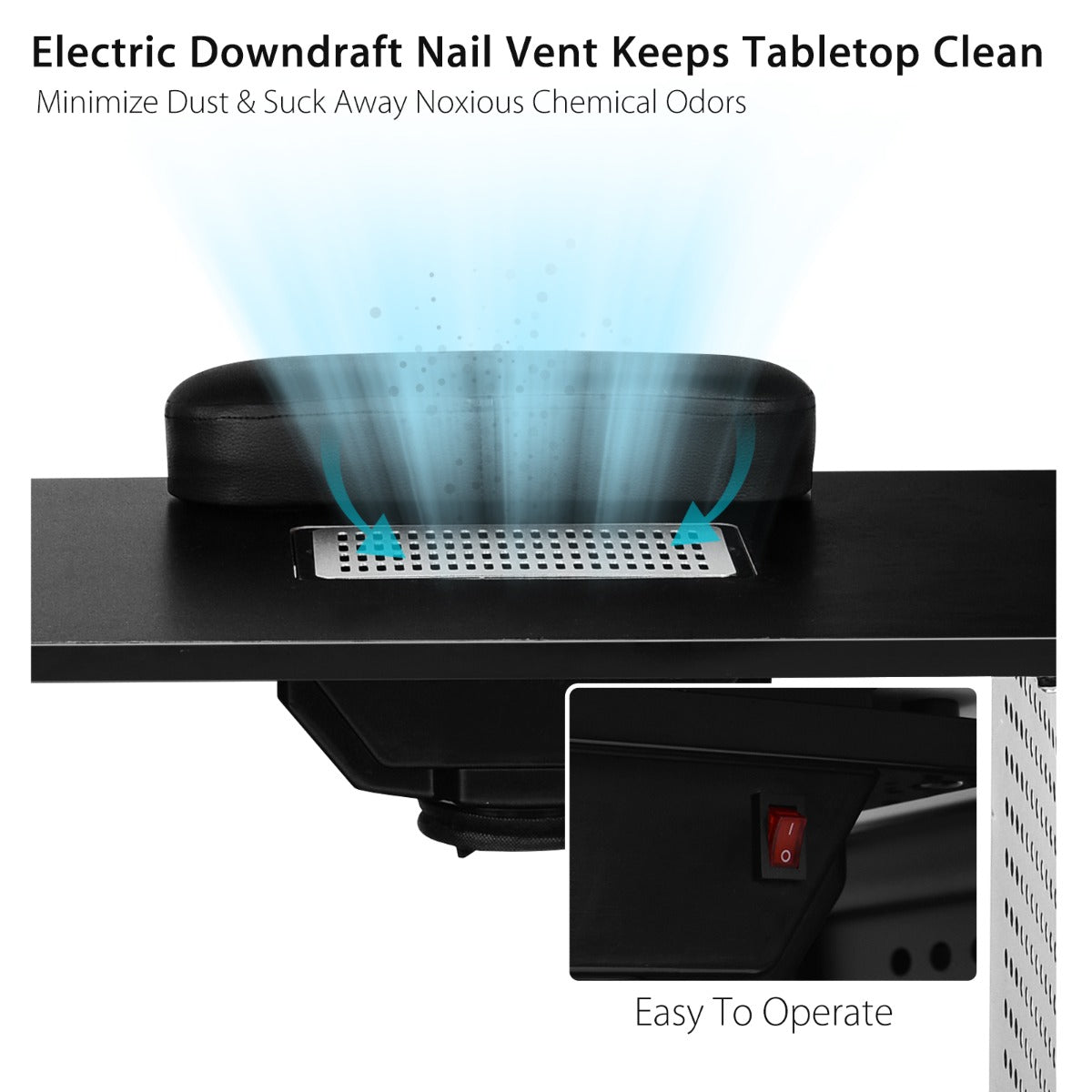 Electric Downdraft Vent: Equipped with an electric downdraft vent, this manicure table can minimize dust when you are filing nails. Moreover, the powerful machine can ventilate and such away the odour. Plus spacious desktop provides enough space to shape and paint nails for yourself or your client.