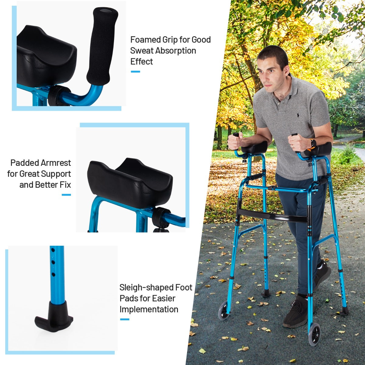 Considerate & Ergonomic DesignThe PU armrests are soft and skin-friendly to touch, while the sponge handles are comfortable and convenient to grip. Installation with no tools required makes the walker easy to use. Besides, two sled-type foot pads reduce friction for smooth movement and increase wear resistance for long time use.