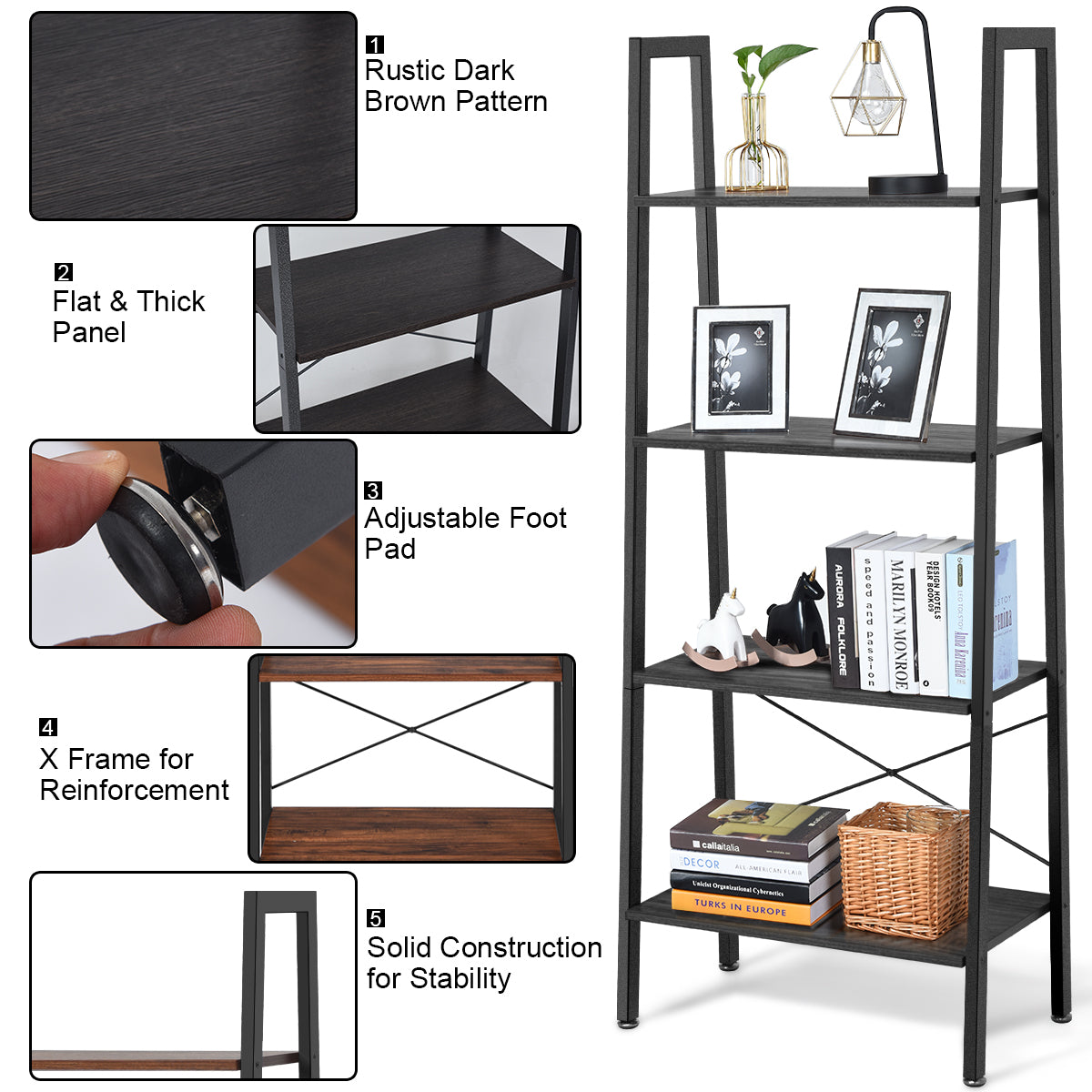 No-Shaking Design: The trapezoidal design makes this 4 tiers ladder shelf will not easy to shake which ensuring its stability. The metal x-type structure behind the base greatly improves the stability of the shelf. The four feet with adjustment pads can be adjusted according to the ground situation to maintain the stability of the shelf and prevent the ground from scratching.