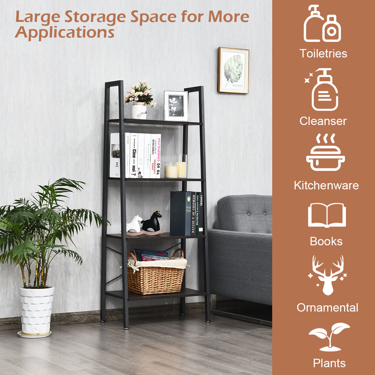 Easy to Assemble: The assembly of this 4 tiers ladder shelf does not require master hand. We will provide all the accessories needed for assembly and detailed instructions for the installation. Simply follow the instructions and you can quickly assemble it. Place the shelf in the corner can give the room more ornamental elements.
