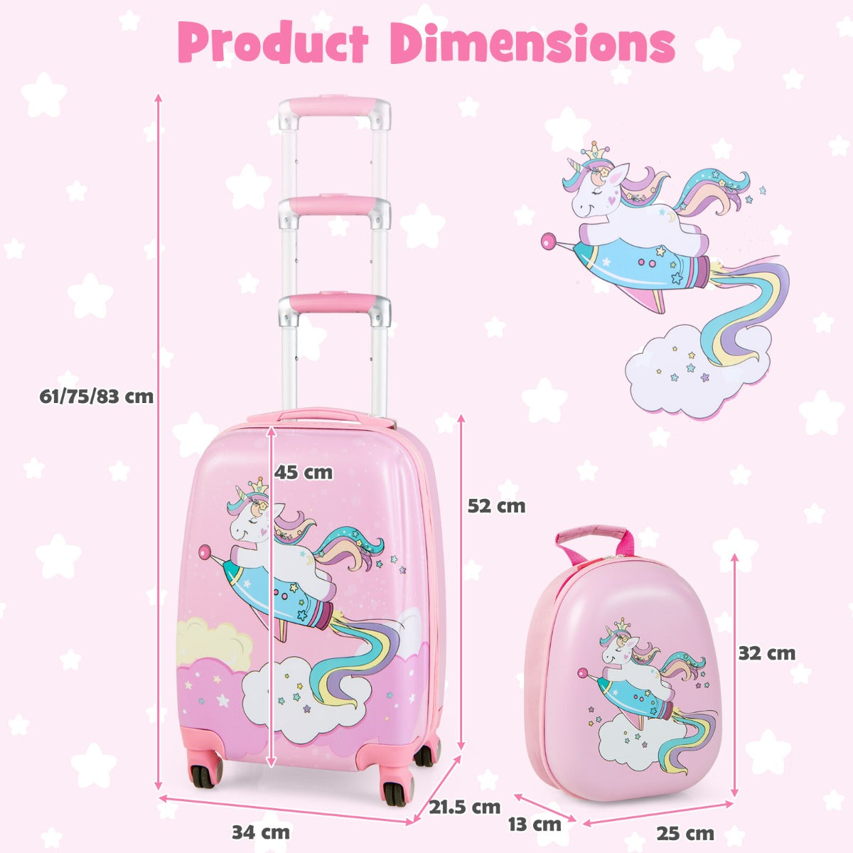 Lovely 2 Pcs Kids Luggage Set: Our kids luggage set includes a travel backpack and a rolling suitcase. Its compact size meets the flight standard, and it is a good choice for both outdoor one-day travel or trip. Besides, this set has a variety of cute cartoon patterns to choose from, which can quickly get boys or girls' attention and harvest their love.