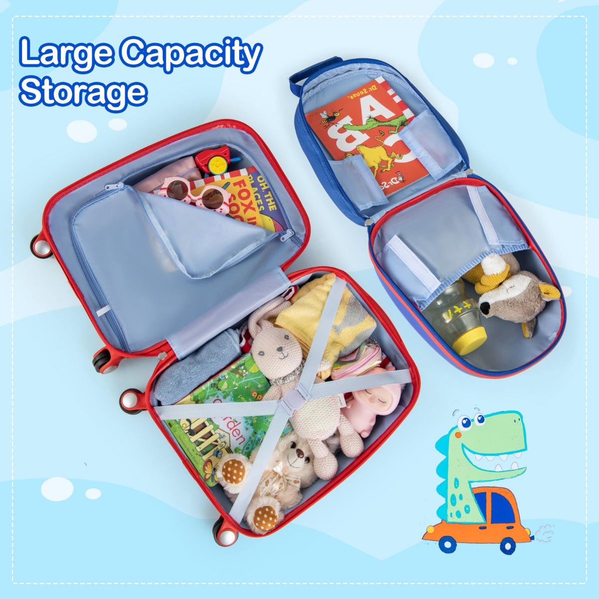 Large Capacity for Travel Essentials: The kid's suitcase has a zippered large compartment and a x-shape elastic strap, which is convenient for storing and fixing toys, clothes and hats. In addition, the backpack has a pocket and a compartment, which are suitable for placing books, snacks, cups, etc. Hence, our kids luggage set is a good way to let kids learn how to store and organize while preparing for travel.