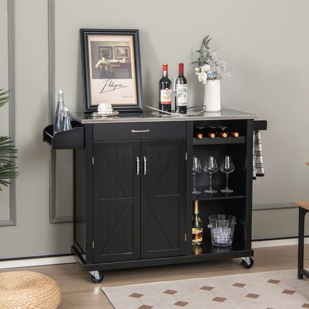 3-level Adjustable Shelf: The shelf in the barn door cabinet is 3-position adjustable to fulfill different storage needs, making this mobile kitchen island suitable for items of different heights. It can be also removed if you want a larger storage space.