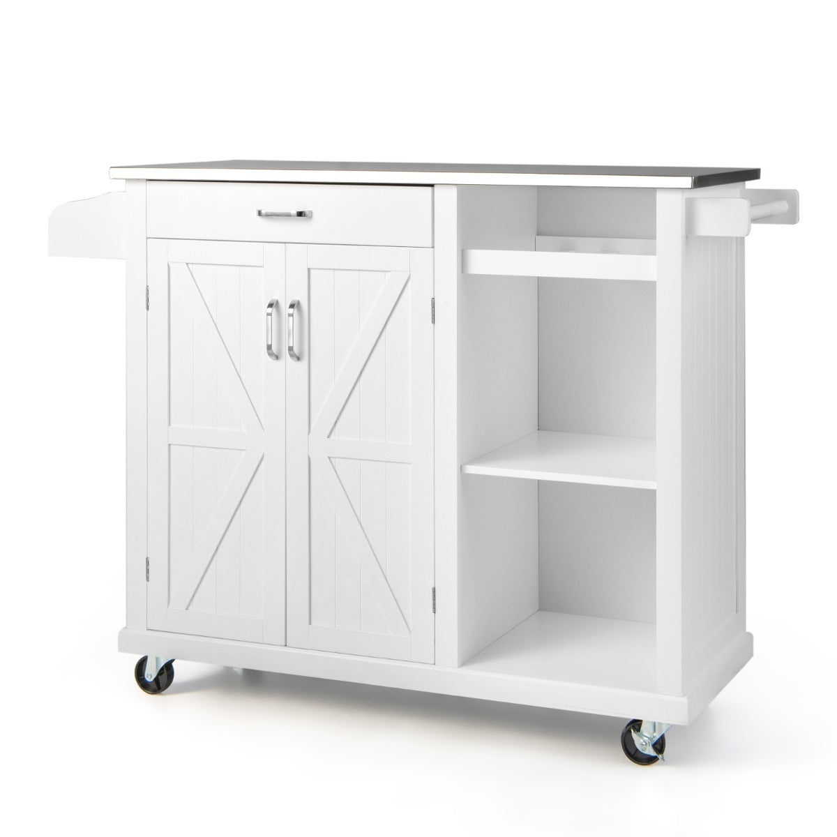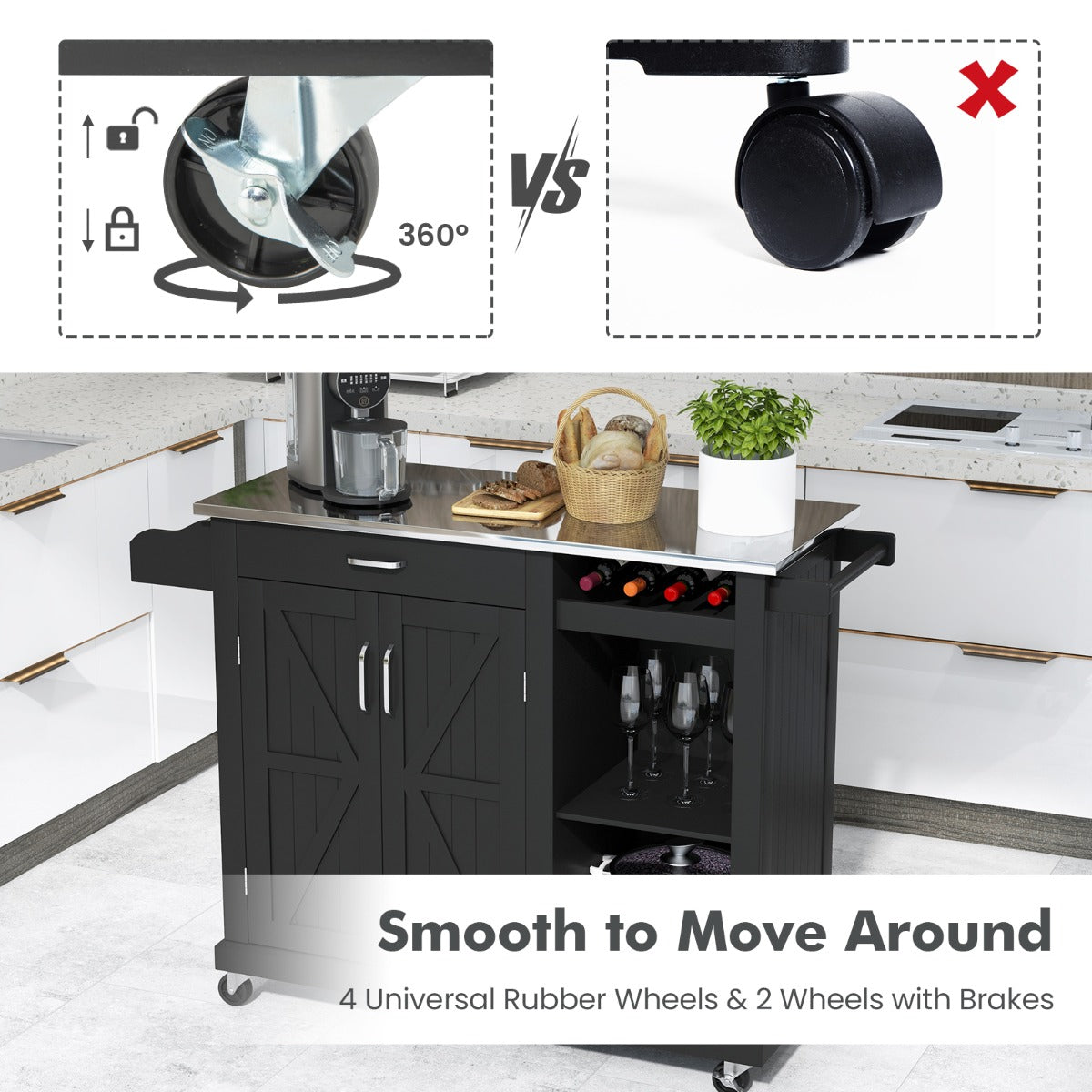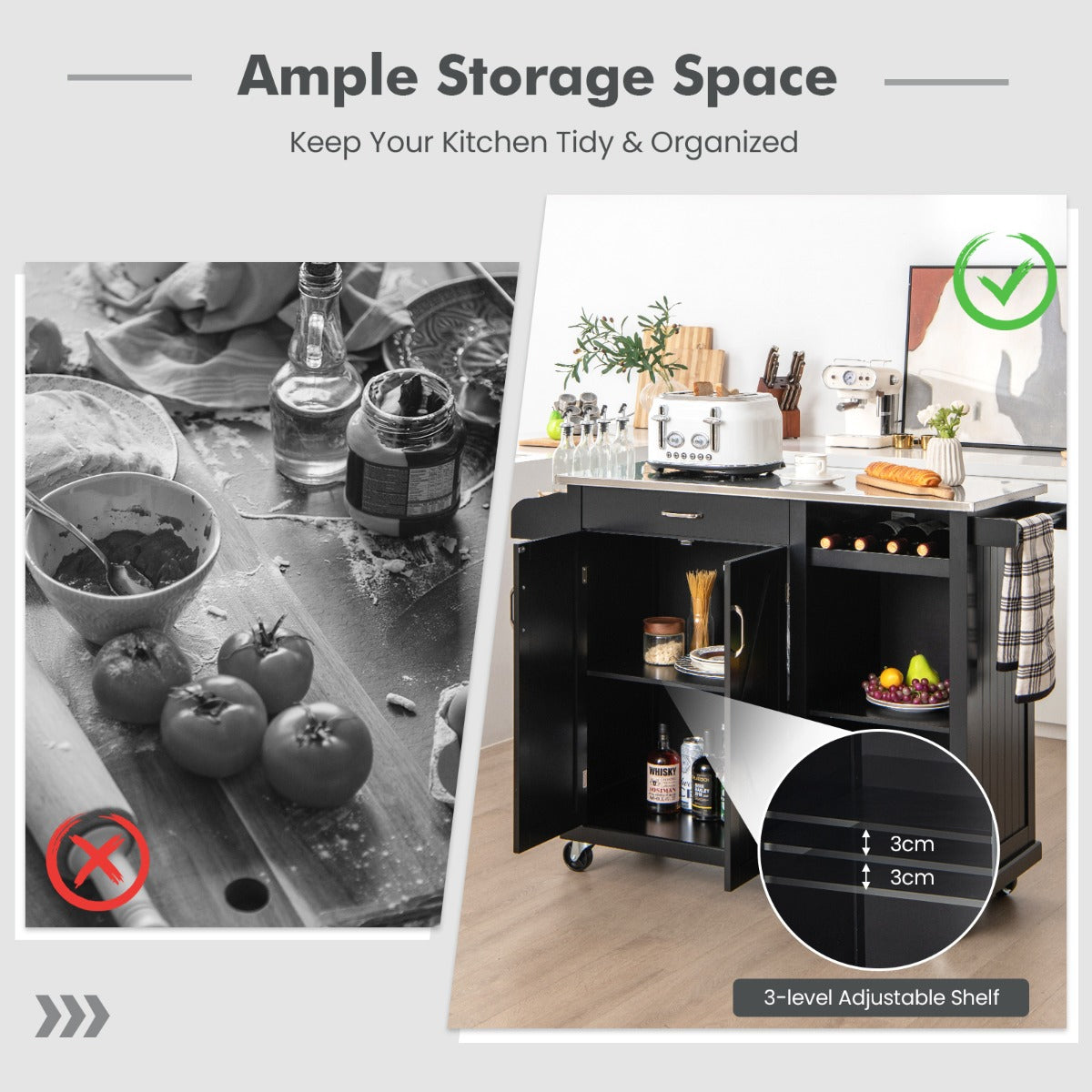 With 4 universal wheels, this kitchen island allows you to move it to the desired place without hassle. And then, lock 2 wheels to keep it in position. After that, the large countertop, spice rack, towel rack, drawer, wine storage shelf, 2-tier open compartment and 2-layer storage cabinet can't wait to provide you with large storage space, making your items well organized. Likewise, there are 2 shelves that can be adjusted into 3 different heights for your different storage needs. What's more, the countertop is made of premium stainless steel that is stable to hold small home appliances while allowing you to clean it with ease.