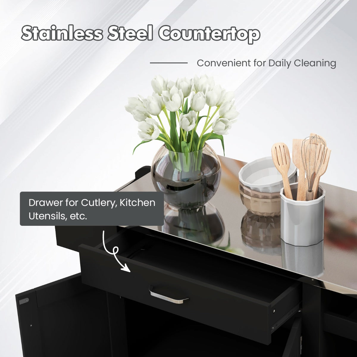 Stainless Steel Top: This stainless steel countertop provides enough space to put your coffee machine, microwave oven and other small appliances. Meanwhile, it is convenient for daily cleaning as well.