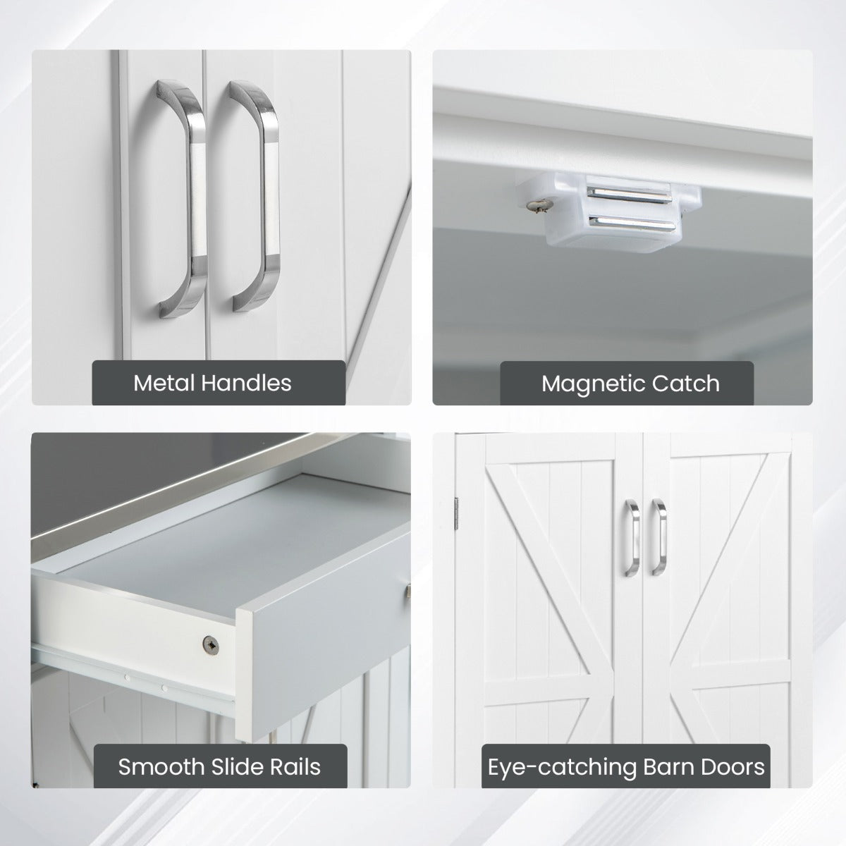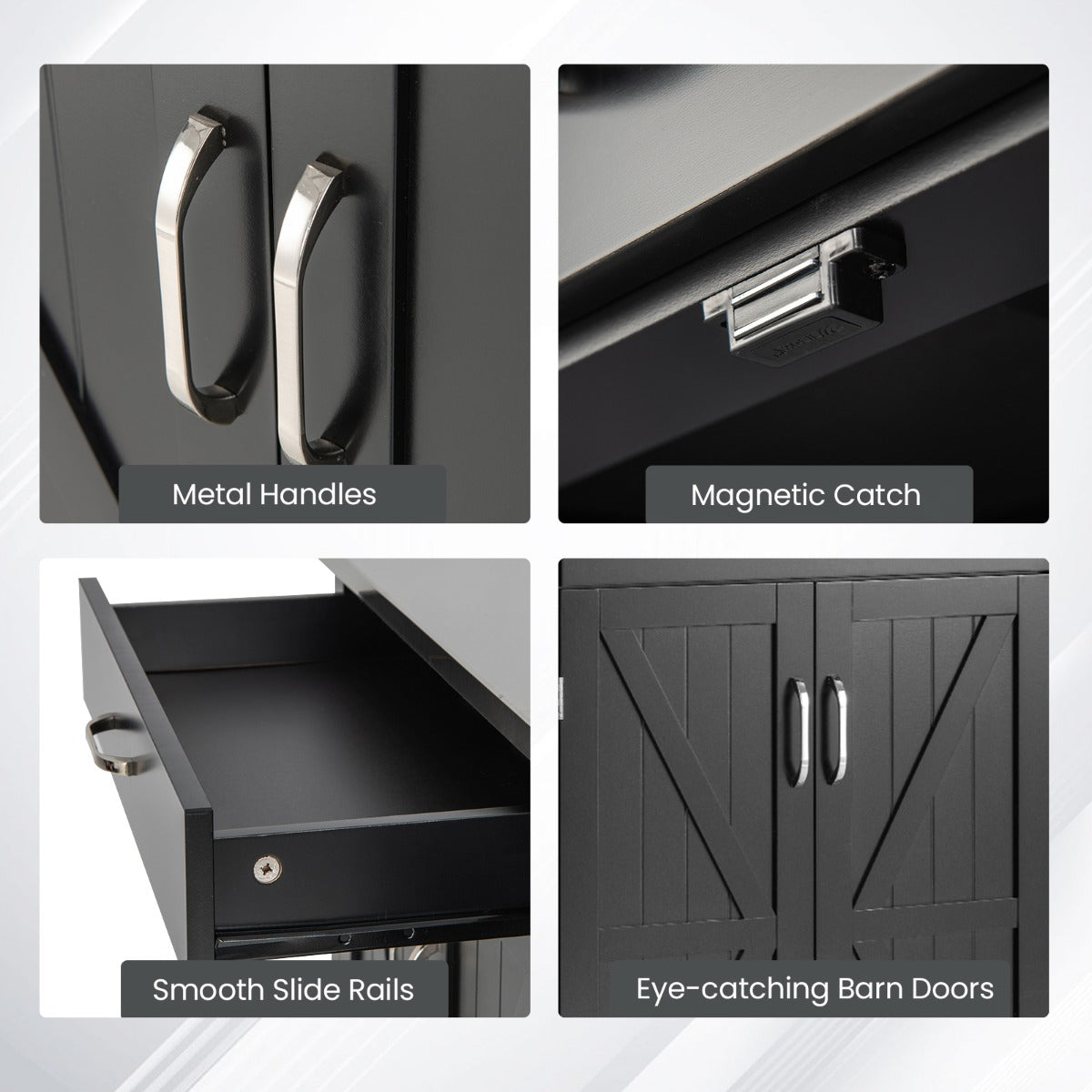 More Details: The metal handles are convenient for you to open the cabinet with durable metal hinges and pull out the drawer with smooth slide rails. Moreover, the magnetic catches keep the doors firmly closed.