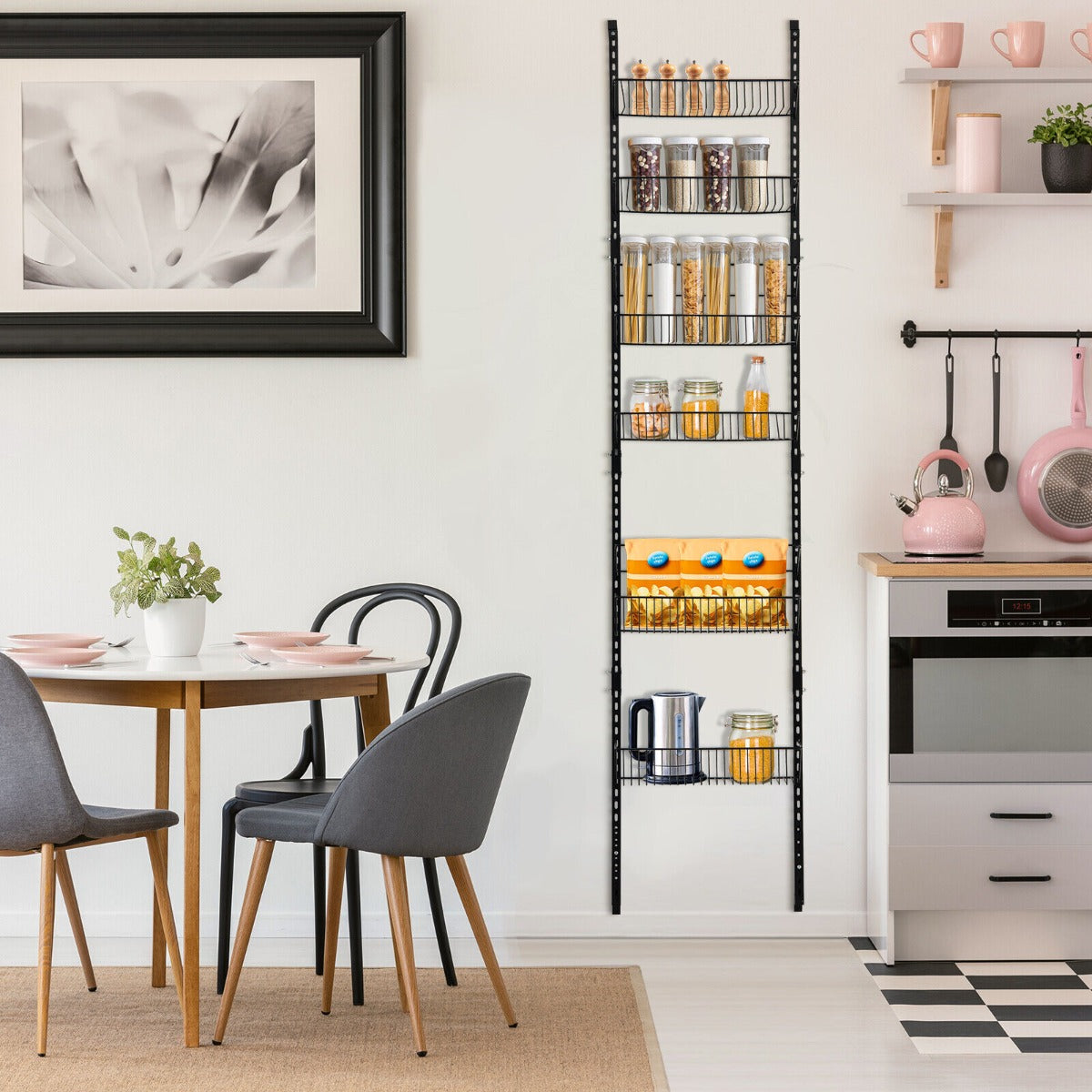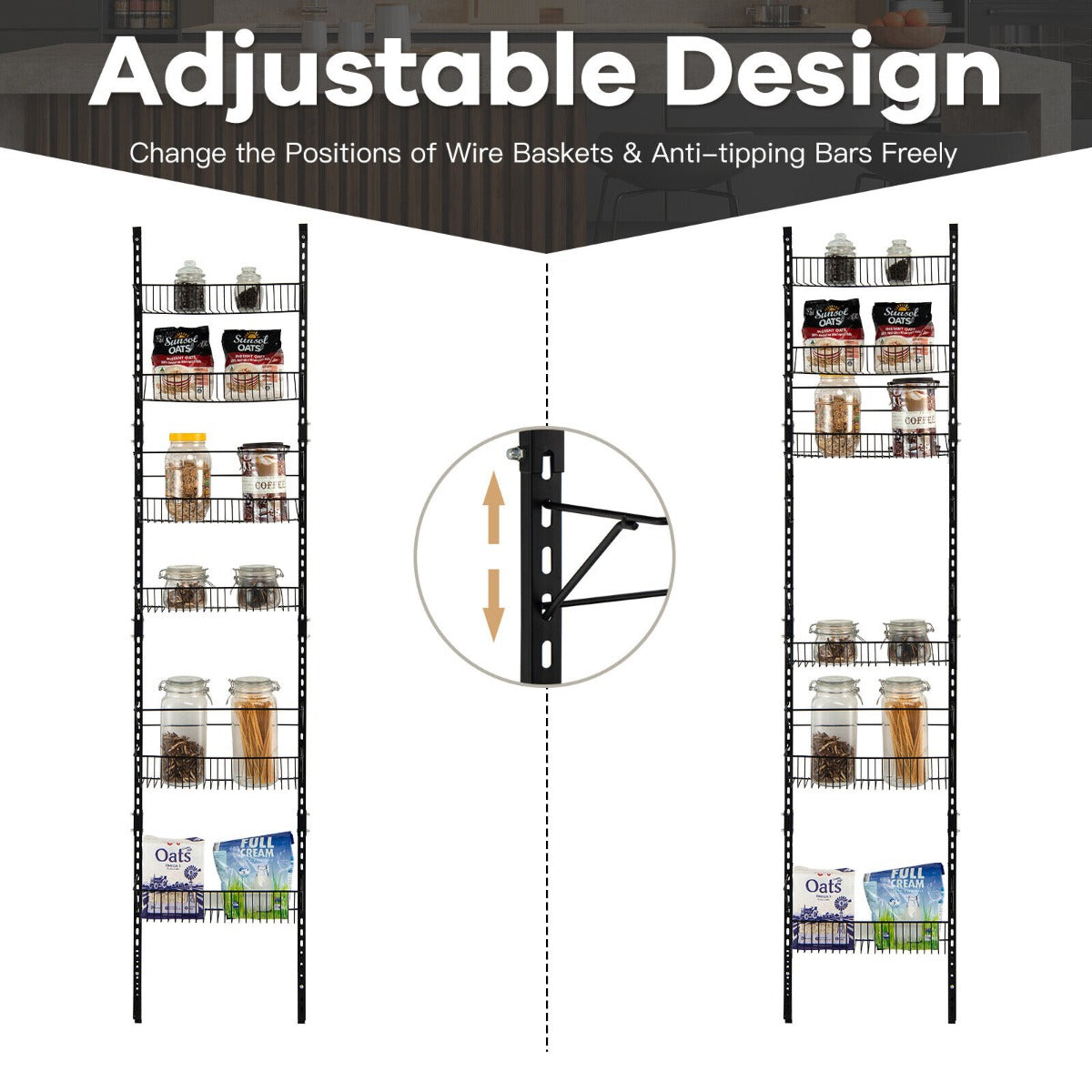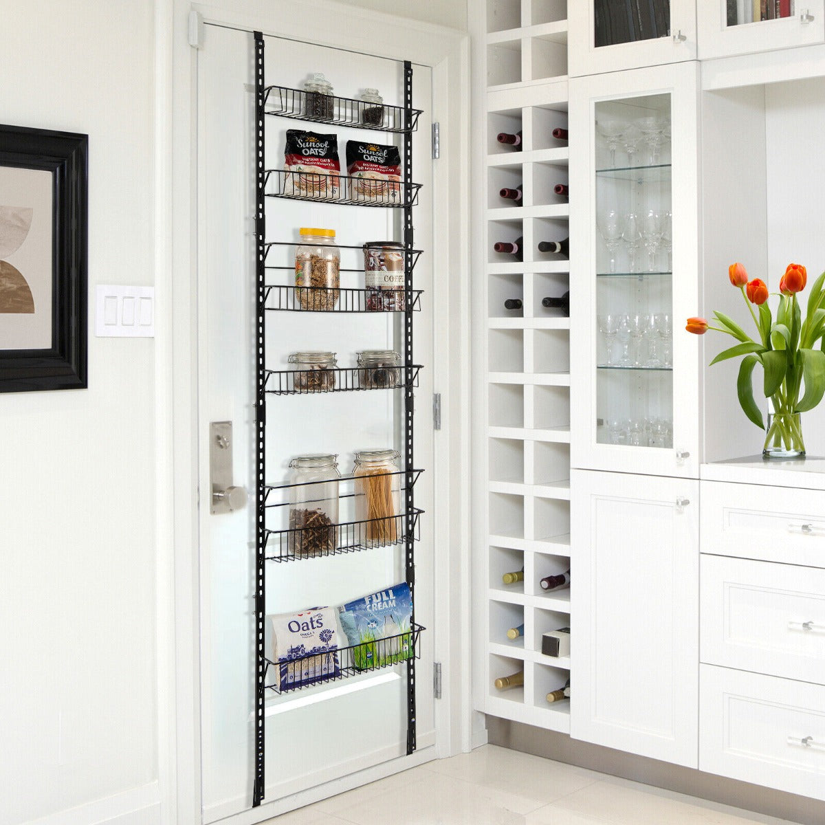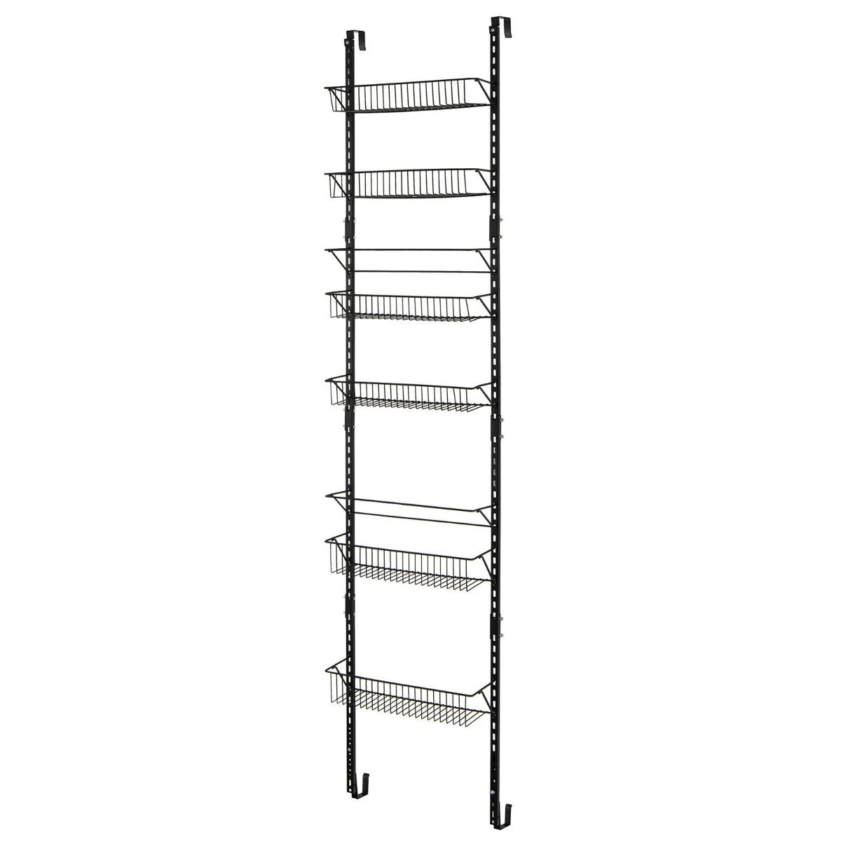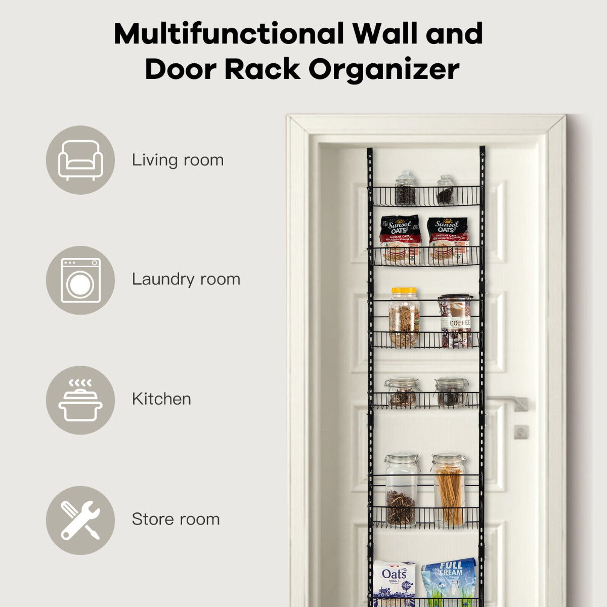 Keep your home tidy and clutter-free with this over the door storage organizer! Our 6-tier wall-mounted pantry storage unit is crafted from sturdy iron frame, ensuring great stability and weight capacity. The rust-resistant surface makes the organizer more durable. 6 large capacity baskets can hold plenty of items, such as spice jars, cans, vegetables, fruit, snacks, towels, wash supplies and more. You can use it in your kitchen, bathroom, pantry storage, laundry, etc. Moreover, each basket can be freely adjusted to different positions. Two anti-falling bars avoid high bottles toppling over. Besides, this multipurpose spiced rack can be installed on the wall or the door according to your different needs.