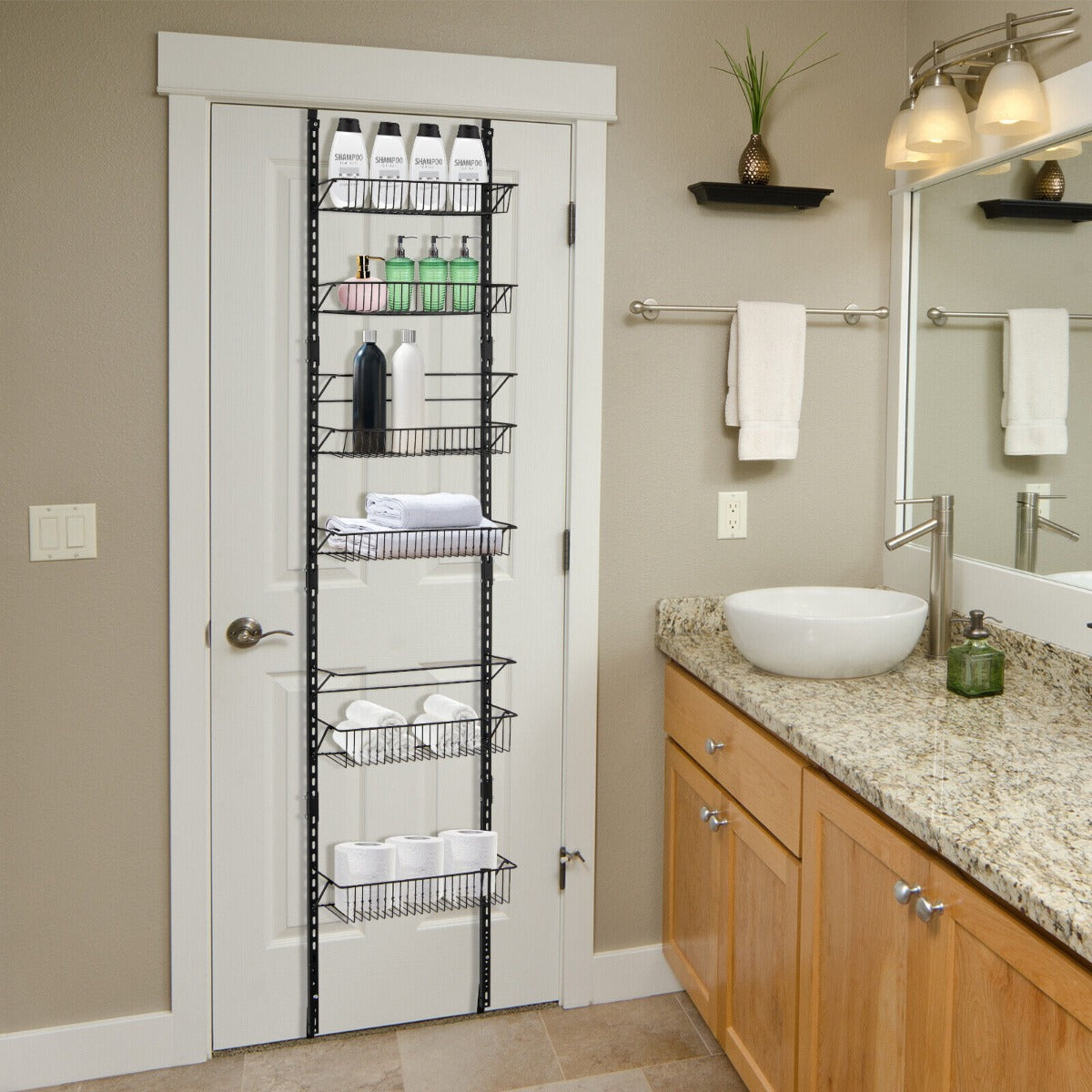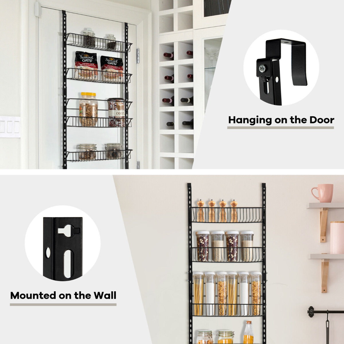 Sufficient Storage Space: This over the door pantry organizer is designed with 6 deep metal wire baskets in two sizes, providing spacious and classified storage space for you. At the same time, the open design helps you keep daily essentials within your arm's reach.