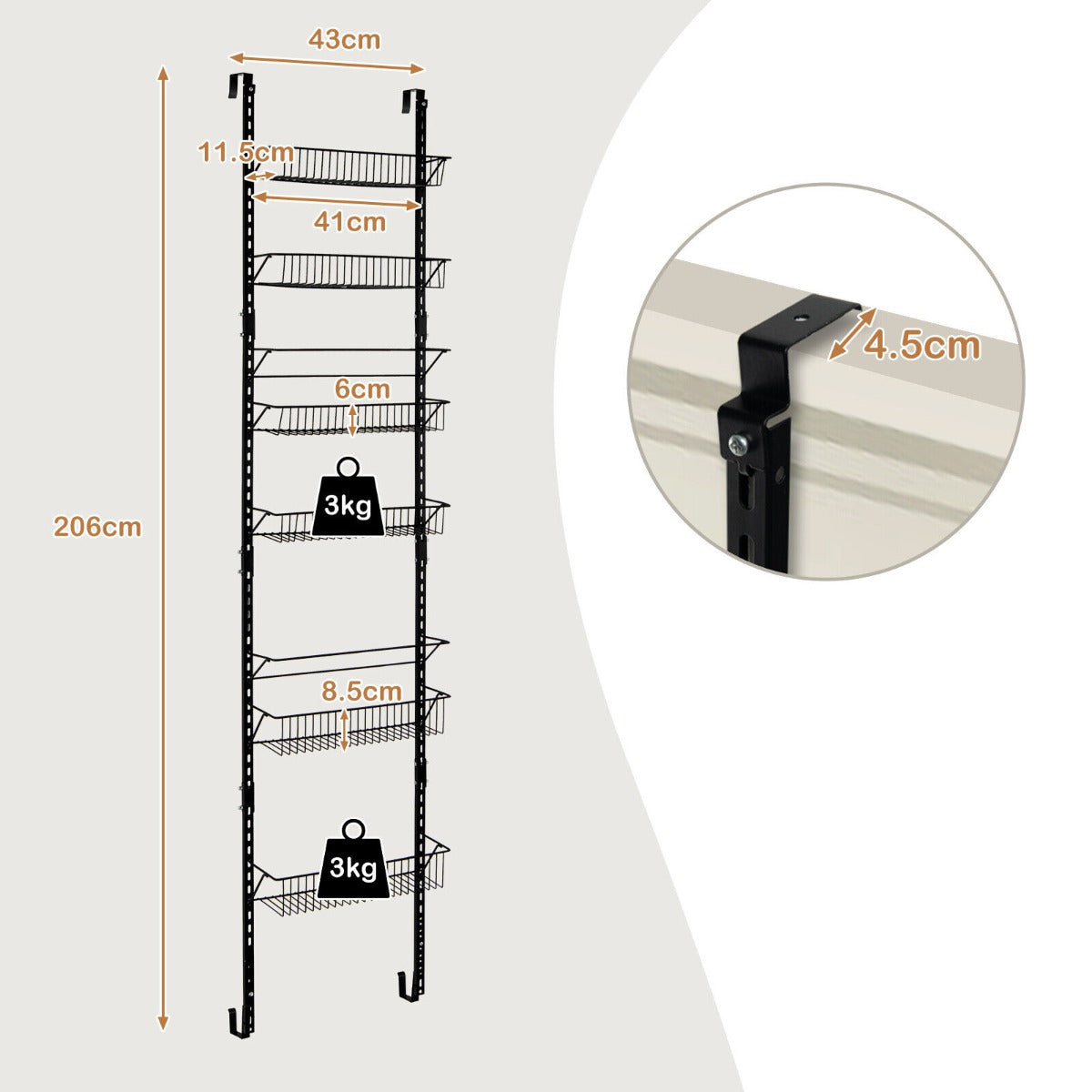 Two Assembly Options: This storage organizer can be mounted on the wall or hanging on the door. With all the necessary accessories and illustrated instruction provided, the assembly process is not difficult for you. The door hook can fit doors up to 5 cm thick. The overall dimension is 43.18 cm x 12.7 cm x 208.28 cm (L x W x H).