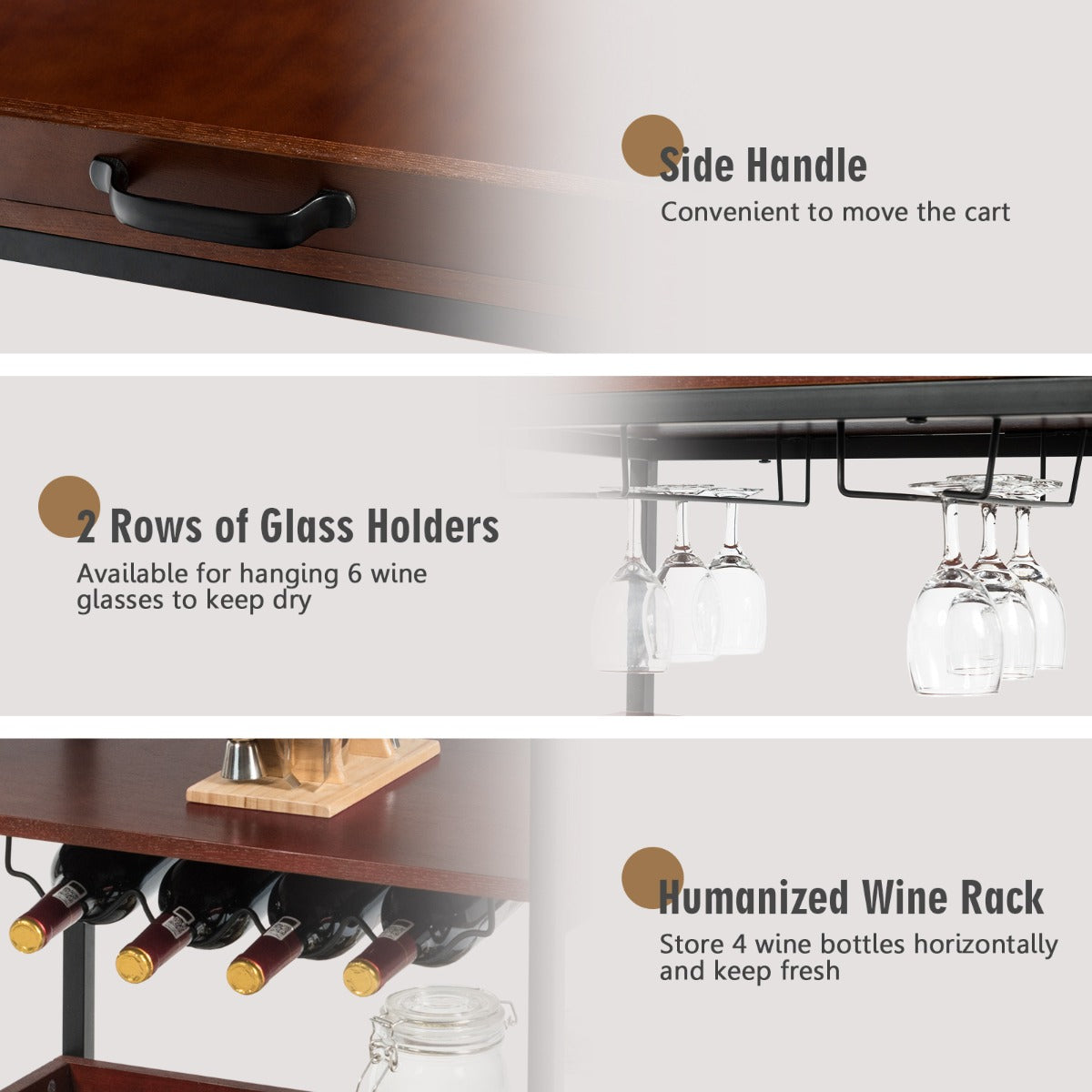 Bar Cart with Ample Storage Space: The bar serving cart with 3-tier open shelves provides large storage space for your food, wines, desserts, kitchen supplies or any other dining essentials, making your kitchen or dining space neat. Besides, 2 rows of glass holders and a single wine rack can hold 6 glasses and 4 wine bottles.