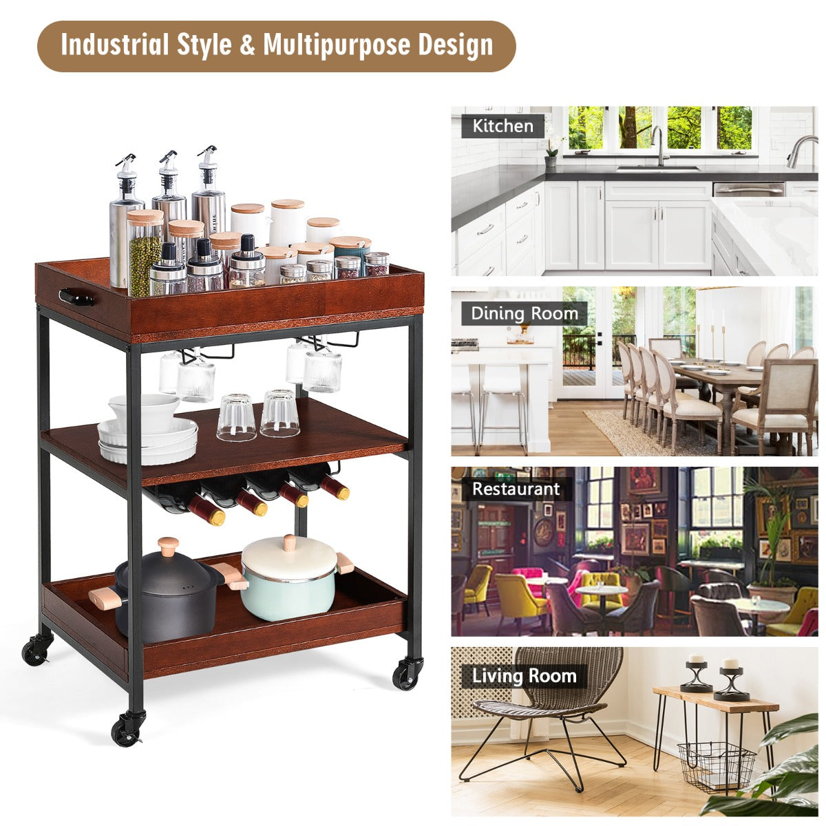 Industrial Style & Multipurpose Design: This rolling kitchen trolley combines an industrial style with a simple design, which can fit well with any home decor style. Thanks to its great practicality, this bar cart is ideal for kitchens, restaurants, dining rooms, bars or anywhere, offering convenience to store and transit food, drinks, etc.