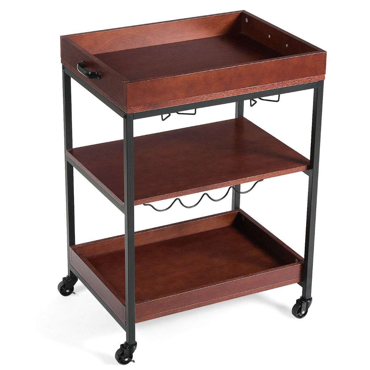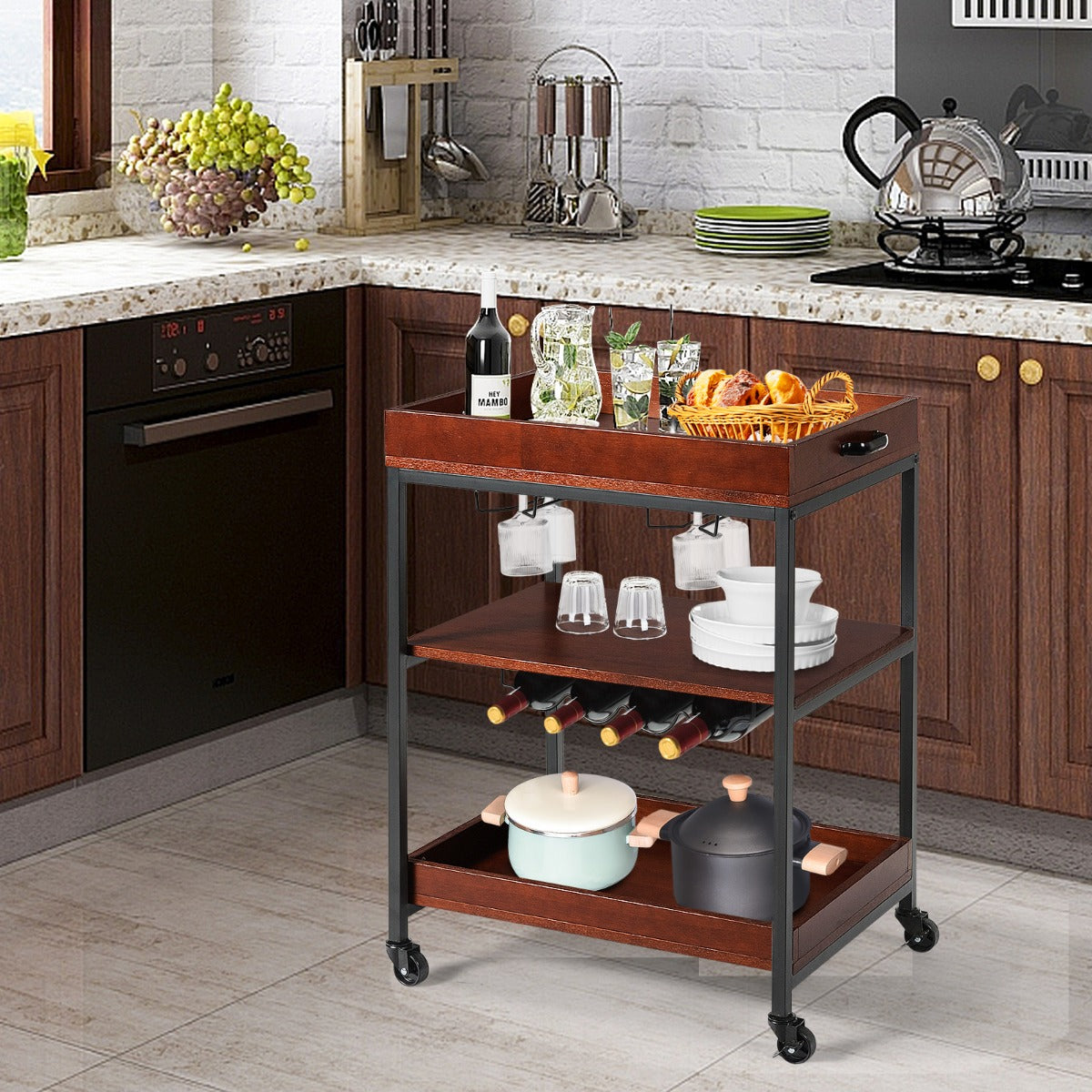 Made of high-quality wood board and a sturdy metal frame, the cart is extremely durable with greater bearing capacity. The three-tier structure provides a lot of storage space, and you can place items layer by layer according to your needs. With a two-row wine cup holder and single-deck wine rack, the cart makes the kitchen more organized. Equipped with 4 rolling casters, it's easy to move in the kitchen. It is ideal for kitchens, bars, restaurants and more.
