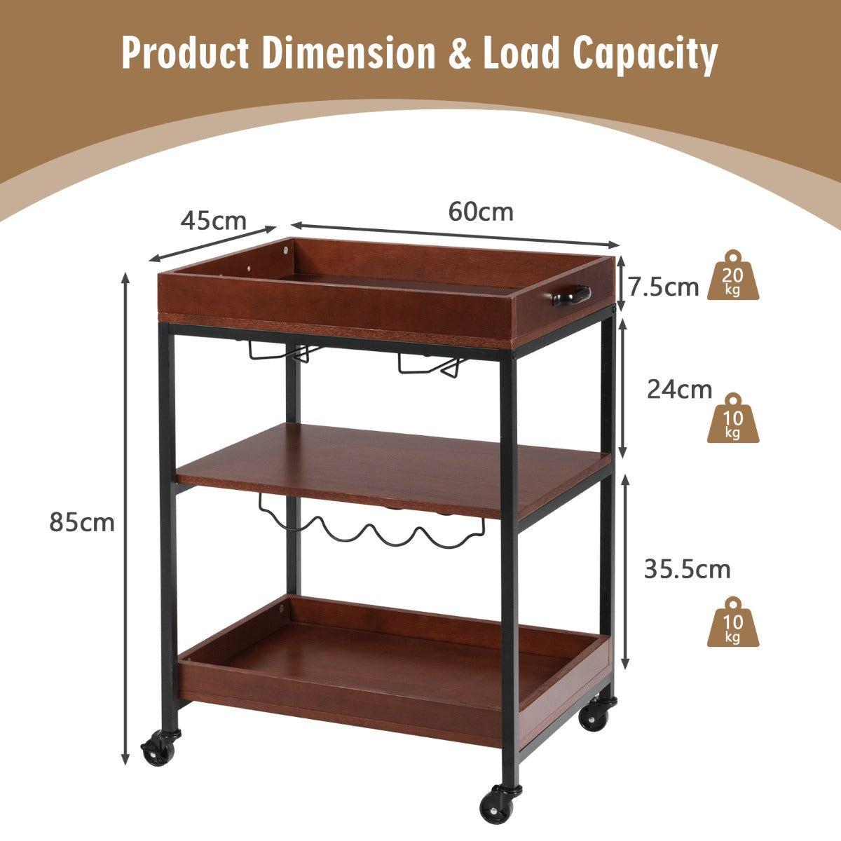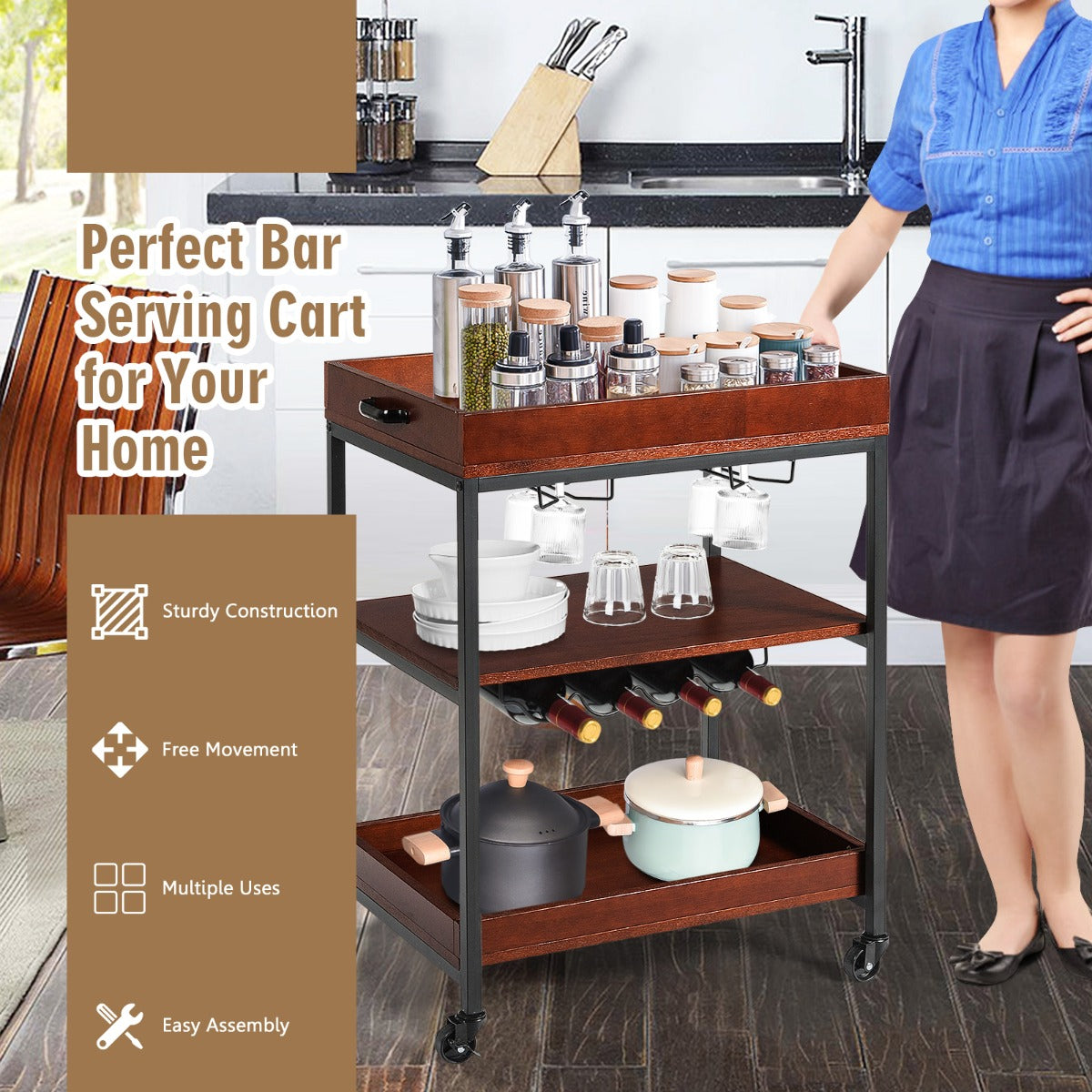 Premium Material & Sturdy Structure: Made of high-quality engineered wood with a heavy-duty metal frame, this kitchen bar serving cart is durable and sturdy enough to hold your dining essentials or other items with a strong load capacity. Moreover, the top and bottom shelves feature raised fences to prevent wine bottles from falling.