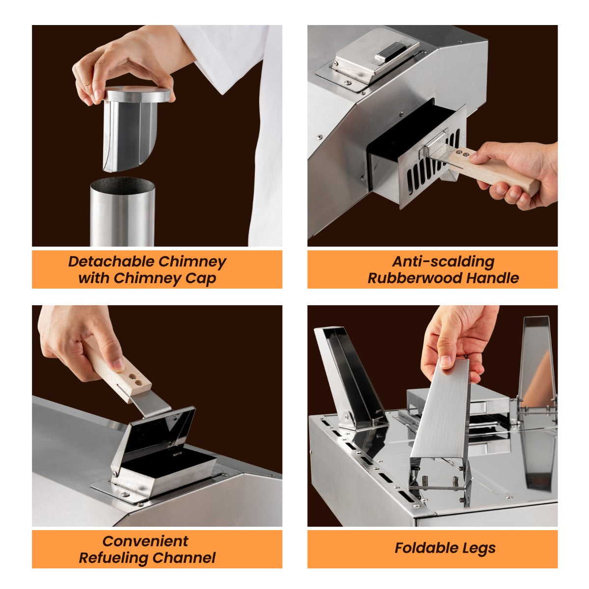 Detachable chimney and foldable legs for convenient storage and carriage