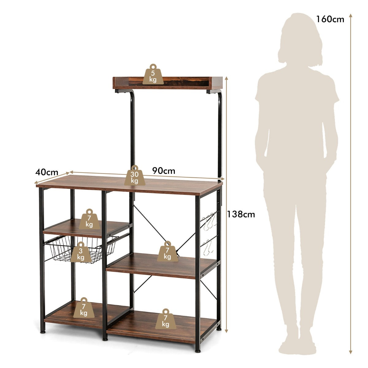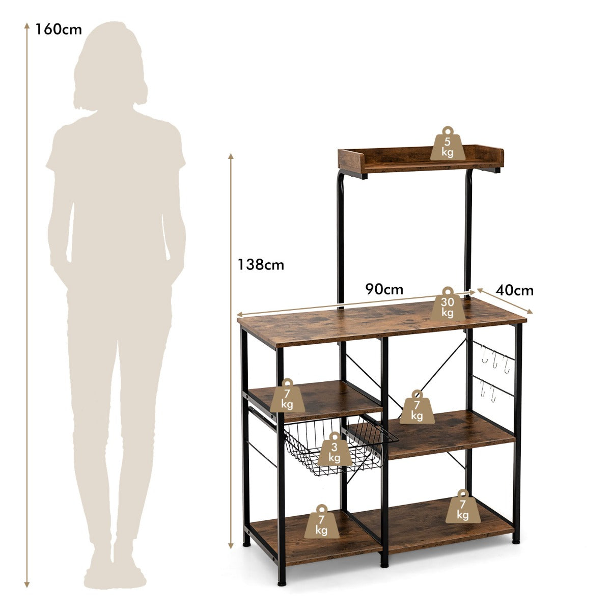 Clutter-free Storage Solution: There are 5-tier shelf in total to provide abundant storage space for all sorts of kitchen supplies. In addition, 5 s-shaped hooks allows you to hang cooking tools and towels with great convenience. Additionally, the pull-out wire basket makes it easier to store dishes, tableware, fruits and vegetables.