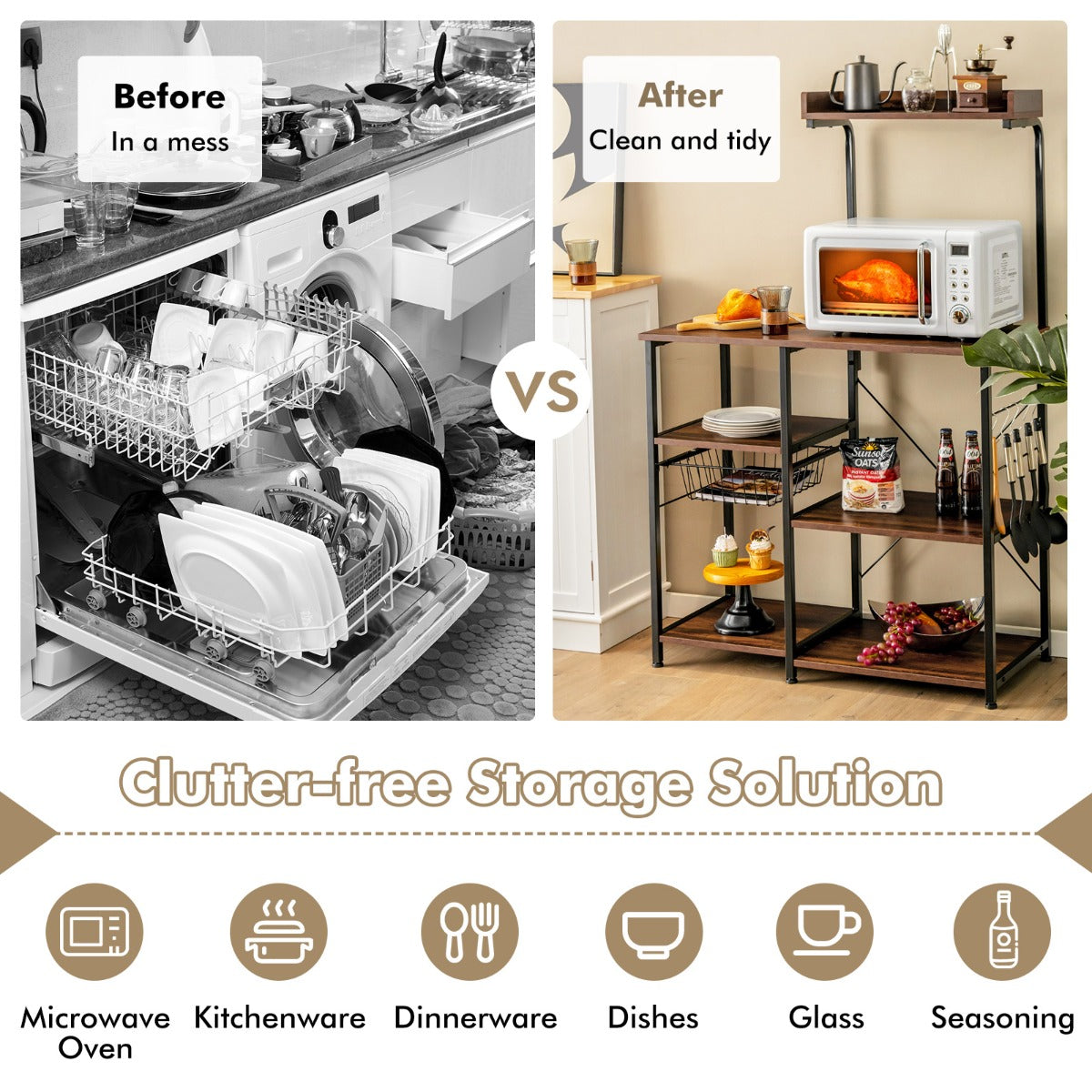 Large Countertop & Top Hutch: The kitchen baker's rack comes with a wide countertop that measures 90cm x 40cm, providing enough space for microwave oven, coffee maker or other kitchen appliances while making your kitchen neat and tidy. Other than that, the top shelf facilitates the placement of spice jars.