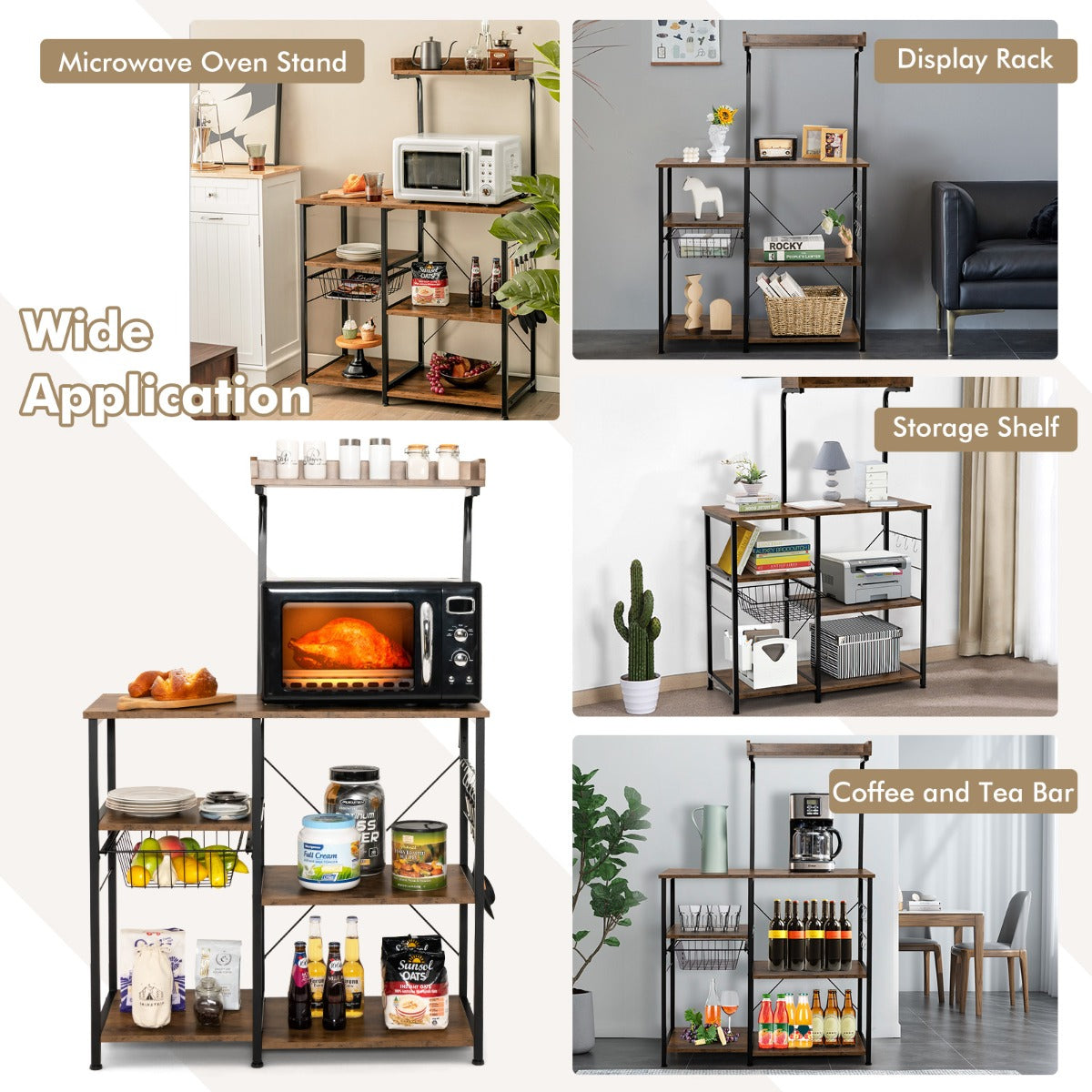 Industrial Style & Versatile Use: The industrial design and sleek lines match seamlessly with any room style and add refined sensation to various occasions, including kitchen and dining room, etc. Whether used as a microwave oven stand, coffee station or spice rack organizer, the baker's rack will undoubtedly be a charming complement for your home.