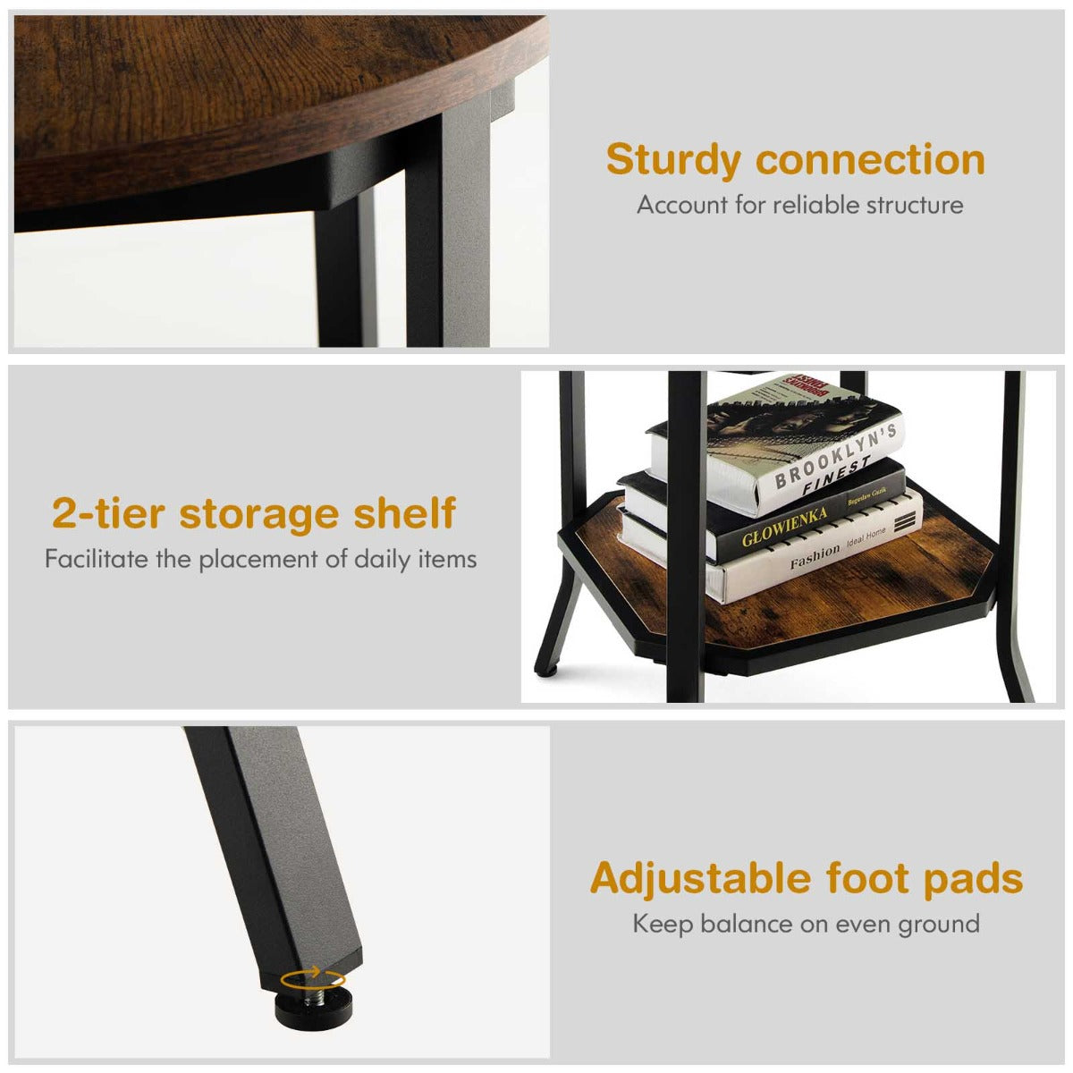 Thoughtful Design: This industrial end table is compact to take little space. Child-friendly round design protects your knees from bruises. And it is equipped with adjustable non-slip footpads to keep stable even on uneven ground, while prevent the floor from being scratched.