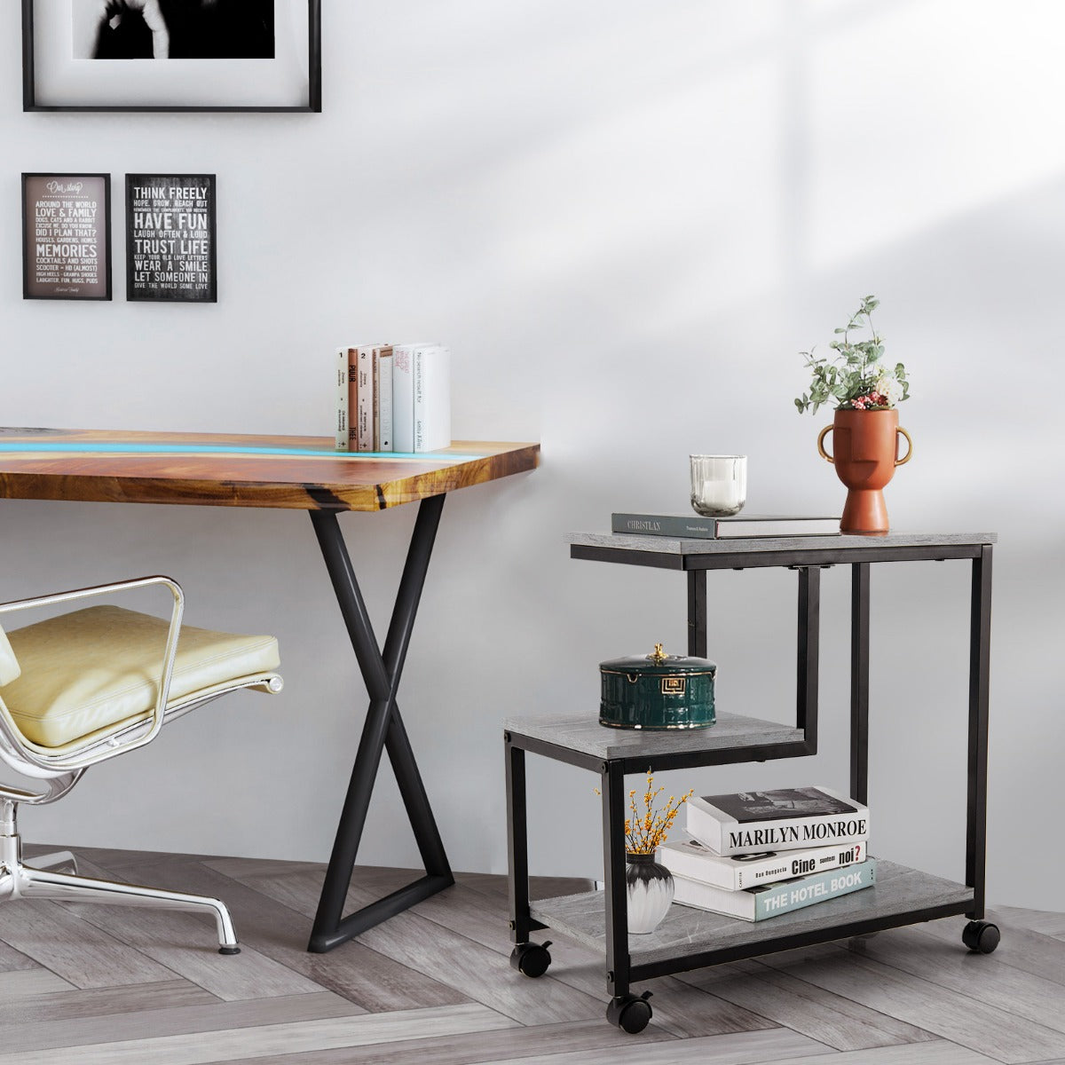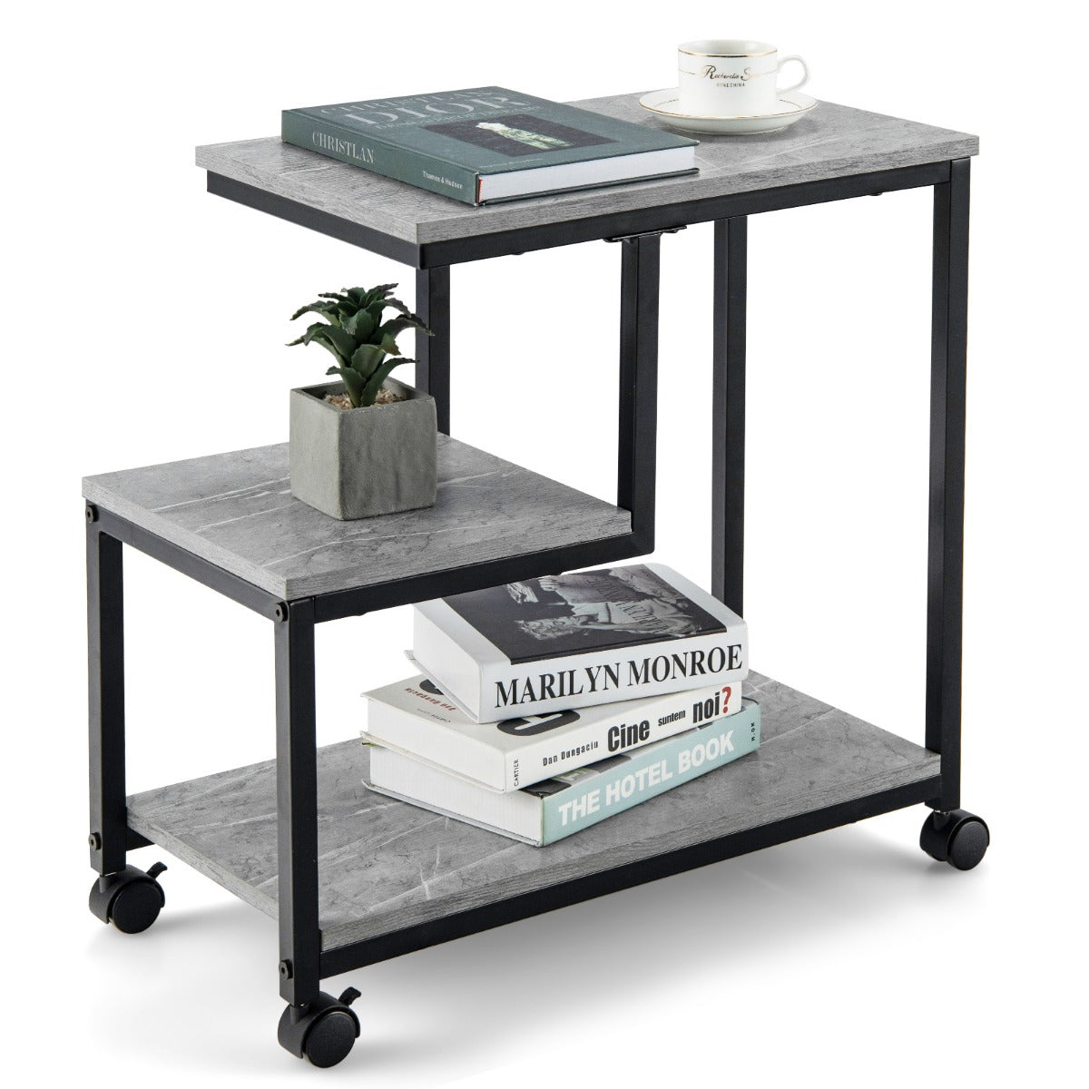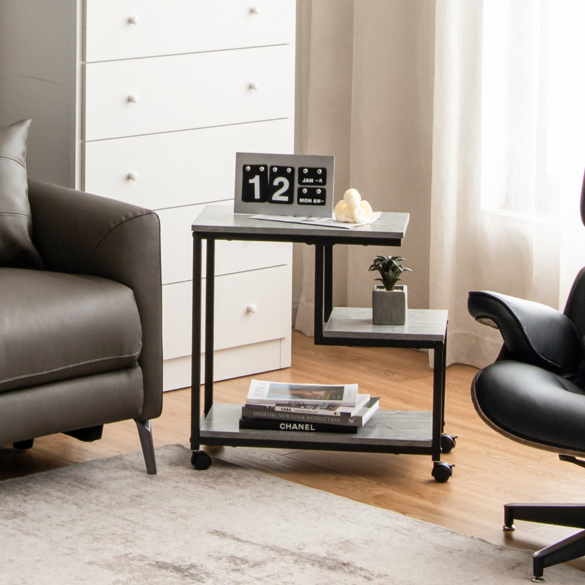 This side table is designed to be appealingly simplistic but for multiple occasions. You can put it in the living room as a sofa side table or place near the bed as a night stand. Wherever it stands, it makes your room tidy and your life simple. Its 3-tier design offers plenty of storage space yet it also features a compact size to fits narrow places as well. With sturdy and durable construction, the table is built for long-lasting use. You can move it from room to room effortlessly due to its portable wheels. You should have such a marvelous addition for your home!