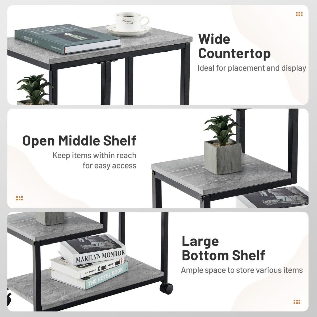Ample Storage Space: This side table is designed in a 3-tier construction, which makes it a perfect space organizer. The wide countertop is ideal for placement and display. An open middle shelf can keep items within reach for easy access while the large bottom shelf provides ample space to store various items.