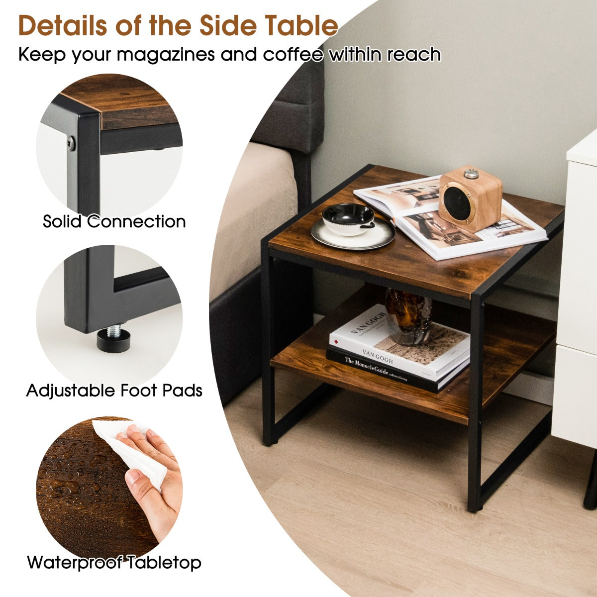 Metal Frame with Superior Stability: Supported by a heavy-duty metal frame, the accent table boasts a reliable construction and large weight capacity, of which the tabletop can support up to 50 kg. Meanwhile, the rustproof material also prolongs the service time, and the adjustable foot pads prevent it from wobbling.